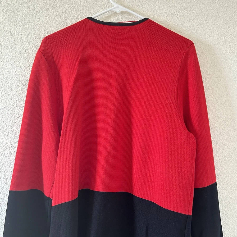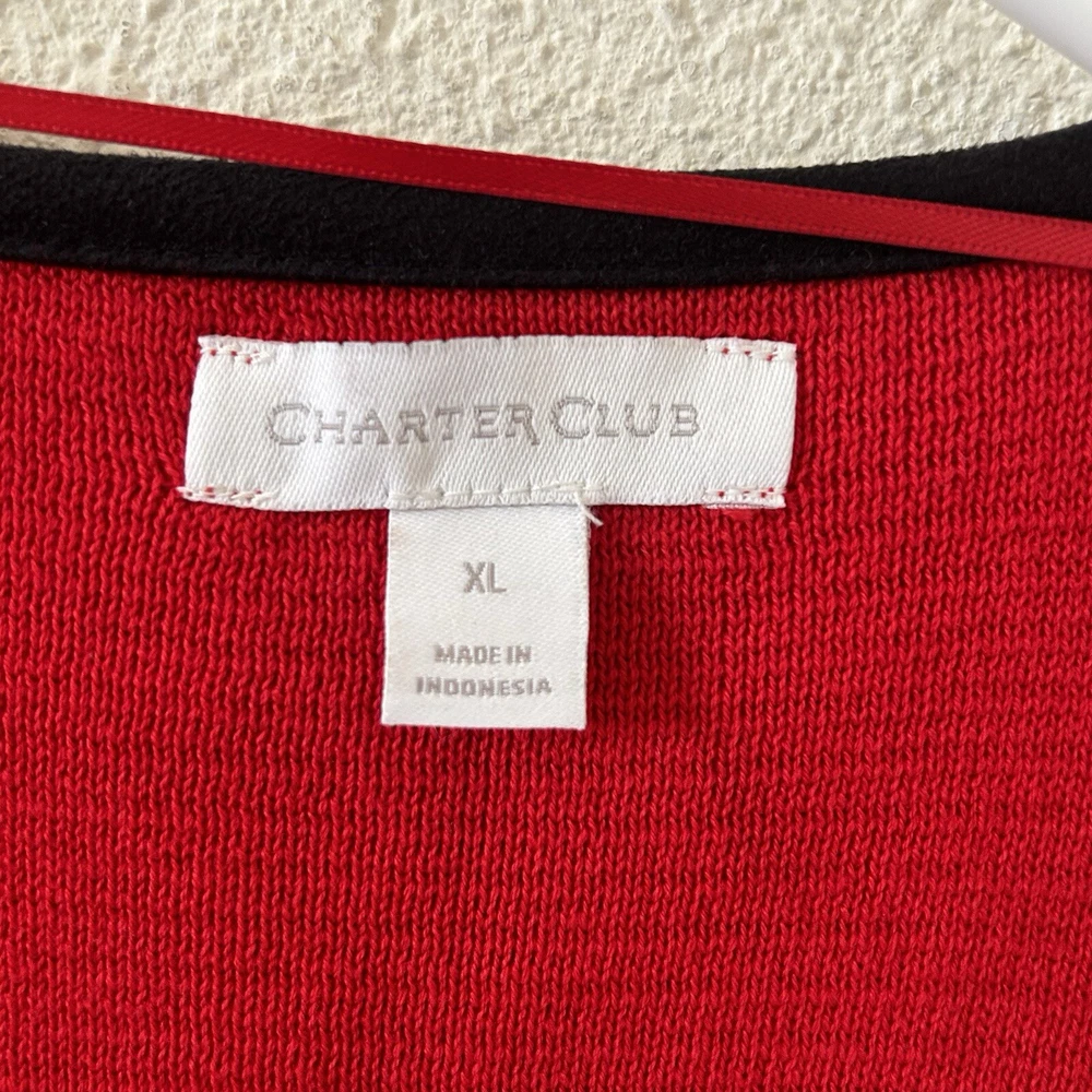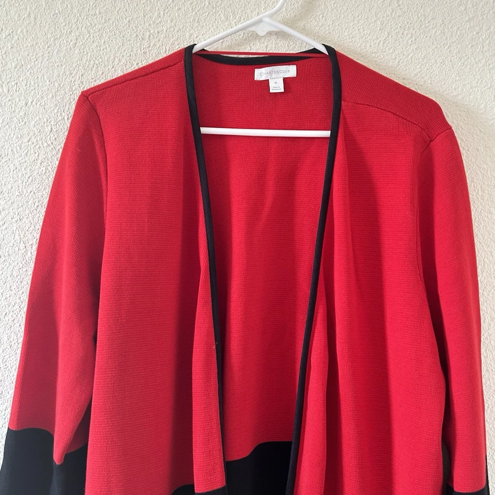 Charter club Women’s Longline Cardigan XL Red Black Dressy Church Work Office in great condition/ stretchy/ zip pockets / color lock red and black 21” across pits 33” length 31” sleeve from neck Approximate measurements All final sale #90 Dressy church work office business career wear teacher party Holiday Christmas party