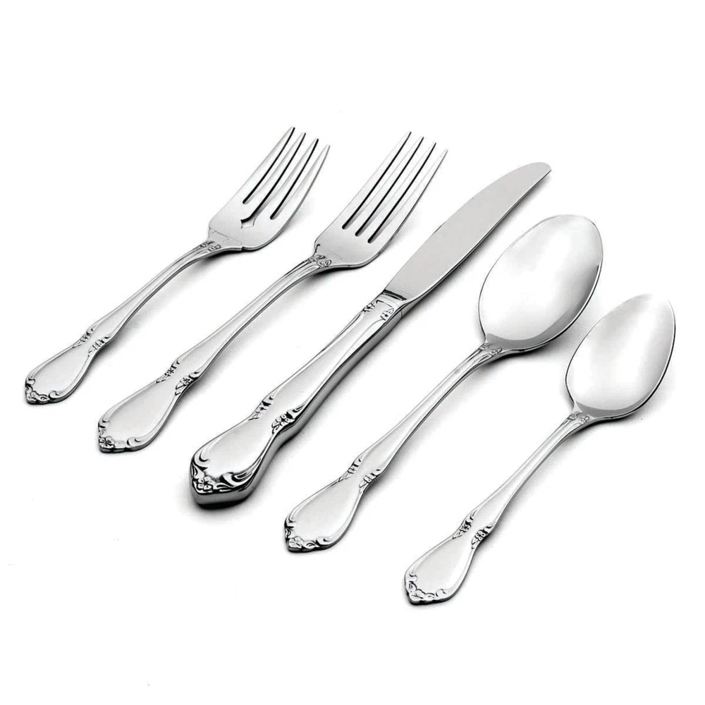 Subtly decorative, Chateau flatware is a good starter set for everyday dining and occasional entertaining. The pattern combines gently curvy silhouettes with delicate border detailing of simple scrolls and flowers. A gleaming mirror finish calls out the designÂ’s sweet lines. Crafted from 18/8 stainless steel, Chateau is 18 percent chrome for corrosion-resistance and 8 percent nickel for luster. This 5-piece place setting for includes a 6-1/4-inch salad fork, a 7-1/4-inch dinner fork, an 8-1/2-inch knife, a 6-3/4-inch soupspoon, and a 6-inch teaspoon. The entire pattern is safe in the dishwasher, and includes a full . --Emily Bedard What's in the Box 1 place setting. Setting consists of: salad fork; place fork; knife; soupspoon; teaspoon. 5 pieces total. Product Description Sleek yet intricate. Designed but understated. Nod to French manors and intricate baroque detail with Chateau. Its fiddleback shape pops with delicately scrolled flowers. These culminate in a pattern popular since its inception, that promises a timeless staying power for years to come. Mirror finish reflects a sleek shine. Premium quality 18/10 stainless steel. Highest level of rust resistance available. Product backed by a limited and is dishwasher safe.