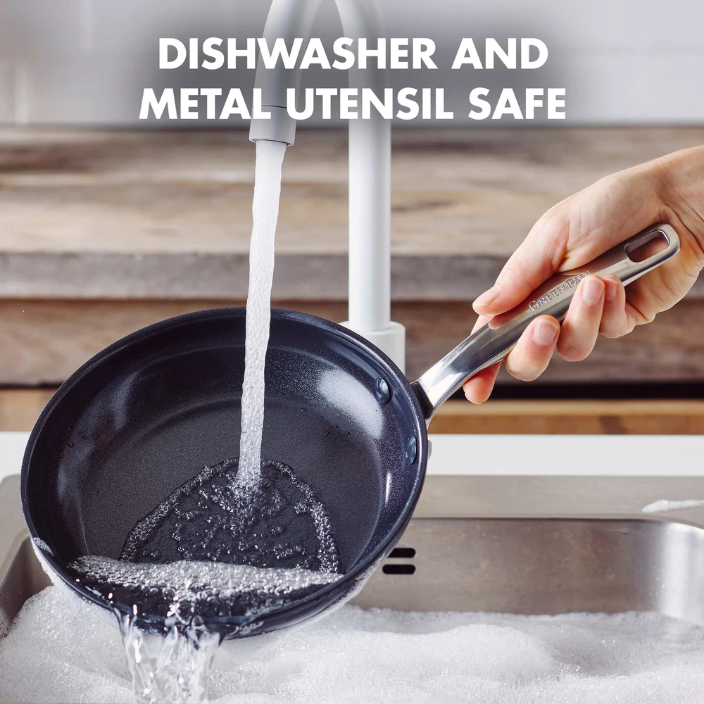 Exclusive! The Chatham Black Prime Midnight collection brings together flawless function and style. This frying pan is crafted from durable hard anodized aluminum for maximum strength and scratch protection. The pan’s metal utensil safe Thermolon healthy ceramic nonstick coating is reinforced with diamonds for extra durability and effortless performance. Manufactured without PFAS, PFOA, lead, or cadmium, our nonstick coating won't release toxic fumes, even if it’s accidentally overheated. Drip-free edges allow for easy pouring and the polished stainless steel handle gives you a secure grip. Dishwasher safe. Oven safe up to 600°F. Limited lifetime . REINFORCED WITH DIAMONDS: Metal utensil safe, 's original diamond-infused nonstick coating offers remarkable durability, balanced heating, and effortless cleanup. TOXIN-FREE: 's healthy ceramic nonstick coating is free of PFAS, PFOA, lead, and cadmium for worry-free meals ULTRA-TOUGH ARMORED BODIES: The hard anodized construction makes these pans extra scratch-resistant and perfect for everyday use. BUILT FOR OVEN COOKING: Oven and broiler safe up to 600°F. ERGONOMIC GRIP: The matte stainless steel handles are riveted to keep you comfortable and in command. VERSATILE DESIGN: Suitable for all stovetops, except induction. DISHWASHER SAFE: Wipe messes clean or toss in the dishwasher for easy cleaning.