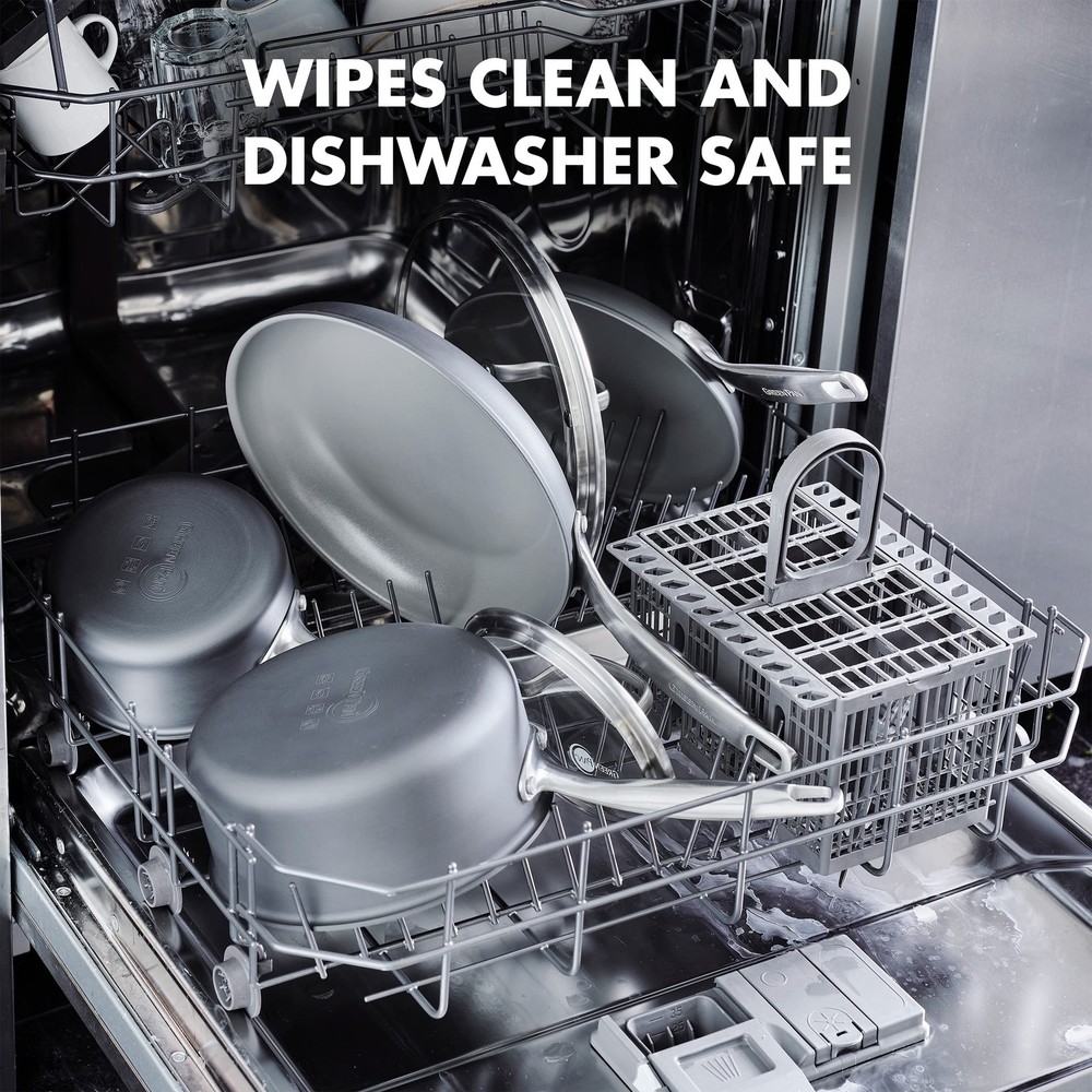 Diamond-infused ceramic nonstick coating for effortless performance and extraordinary durability The coating is free of PFAS, PFOA, lead, and cadmium 3-ply stainless steel body heats quickly, evenly and delivers incredible results Matte stainless steel handle gives you safe and secure grip Chip-free edges protect the coating and prevent damage Oven safe up to 600℉ All stovetops, including induction Metal utensil safe Dishwasher safe