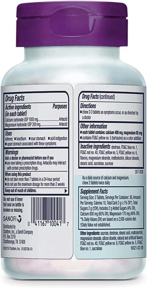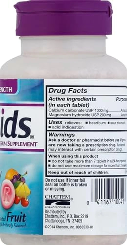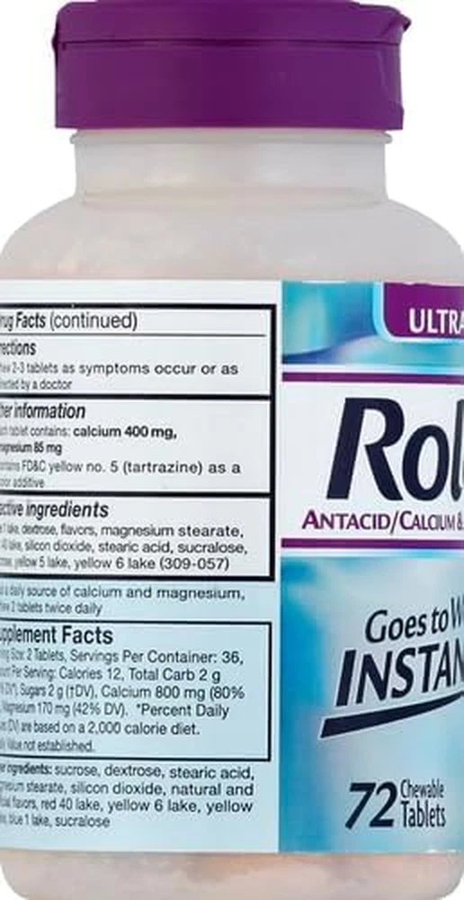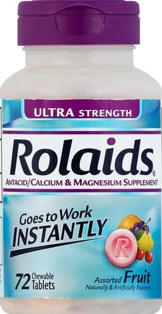 Store New Arrivals Add to Favorite View Feedback Contact Chattem Inc. Rolaids Ultra Strength Antacid, 72 Chewable Tablets, Assorted Fruit, Ultra Strength Heartburn Relief Description Item model number 591467 Item dimensions L x W x H 2.48 x 2.48 x 4.65 inches Is Discontinued By Manufacturer No Product Dimensions 2.48 x 2.48 x 4.65 inches; 0.55 ounces Country of Origin USA Product Benefits Acidity Relief Item Weight 0.55 Ounces Flavor Name Fruit Manufacturer Procter & Gamble Special Feature Dual action formula Brand Rolaids Size 72 Count (Pack of 1) CONTAINS: One (1) 72-count bottle of Rolaids Ultra Strength Antacid Chewable Tablets, Assorted Fruit flavors OLAIDS ULTIMATE ACID-NEUTRALIZING HEARTBURN RELIEF: Rolaids Ultra Strength antacid tablets neutralize more than 100 times their own weight in stomach acid* GOES TO WORK INSTANTLY: Chewable antacid tablets with calcium carbonate and magnesium hydroxide start to work immediately to help relieve heartburn, acid indigestion, and sour stomach CONVENIENT: Chew 2-3 tablets as symptoms occur or as directed by a doctor; do not take more than 7 tablets in 24 hours; do not use the maximum dosage for more than 2 weeks ASSORTED FRUIT FLAVOR: This heartburn relief tablet comes in an assorted fruit flavor For Rolaids ultimate heartburn relief, Rolaids Ultra Strength Antacid Chewable Tablets deliver. Rolaids Ultra Strength antacid neutralizes 15% more stomach acid than Tums Ultra Strength.* Each antacid tablet neutralizes more than 100 times its own weight in stomach acid, so it goes to work instantly.* Rolaids Ultra Strength Chewable Tablets come in an assorted fruit flavor. Keep a bottle of Ultra Strength Rolaids in your medicine cabinet, in the car or in your computer bag to have heartburn relief always on hand. *Acid neutralization does not correlate with symptom relief ABOUT US We offer the best prices around on high quality products. Our E-store includes media such as books, movies, music and games while offering electronics, toys, sporting apparel, clothing, tools, general home, garden items and more. SHIPPING We are always working hard to ensure your package arrives as soon as possible. Please understand that some factors like weather, high postal traffic, and the performance of shipping companies are outside of our control. We offer free shipping to the lower 48 states and ship within 2 business days of payment, usually sooner. We do not accept P.O. Boxes. Please provide a physical address. RETURNS We offer a 30-Day Return Policy on items which you are not completely satisfied with. You have the option for a full-refund or an exchange of the item. No returns are available on items shipped outside of the USA. PAYMENT We accept PayPal. CONTACT US This page content is yet to come Please ad us to your favorite seller and visit again later Thank You CUSTOMER SATISFACTION We try our very best to make sure every customer is completely satisfied. If there's a problem, message us! We're happy to help.