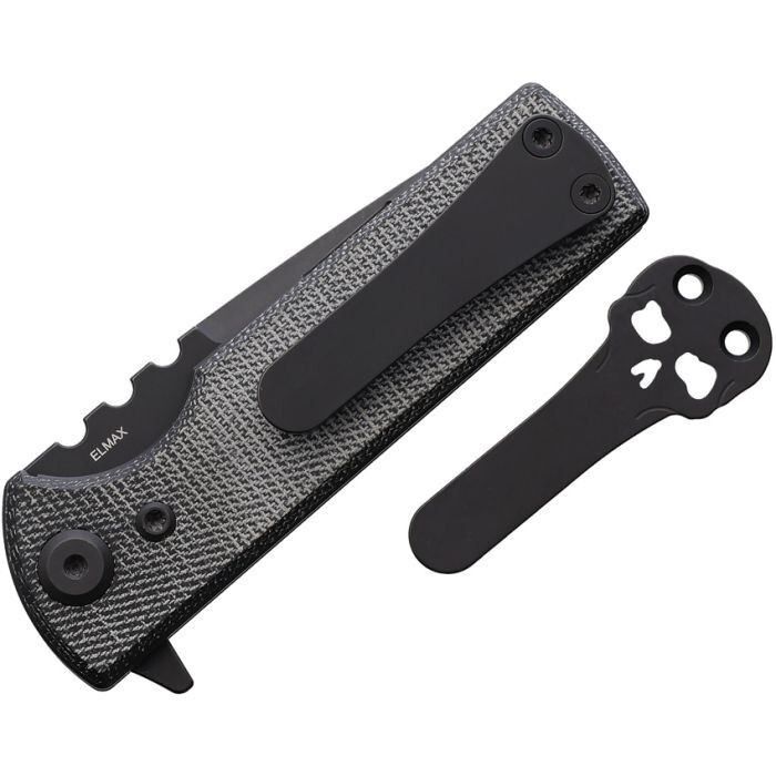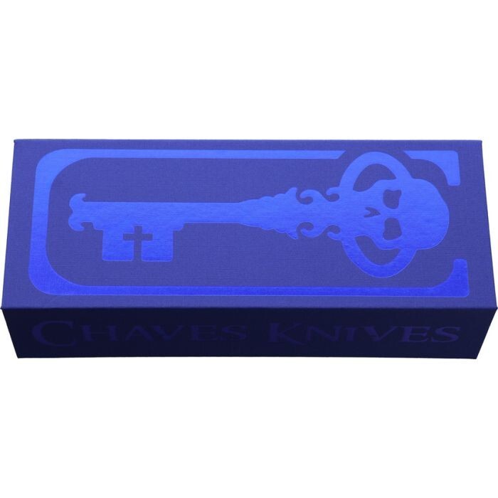 3.38" (8.59cm) closed. 2.63" (6.68cm) black PVD coated Elmax steel drop point blade. Black canvas micarta handle. Extended tang. Pocket clip. Comes with signature Chaves skull titanium pocket clip. Boxed.
