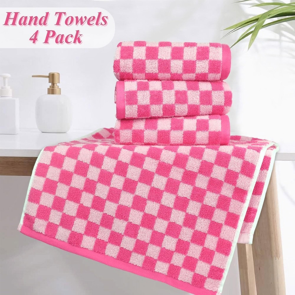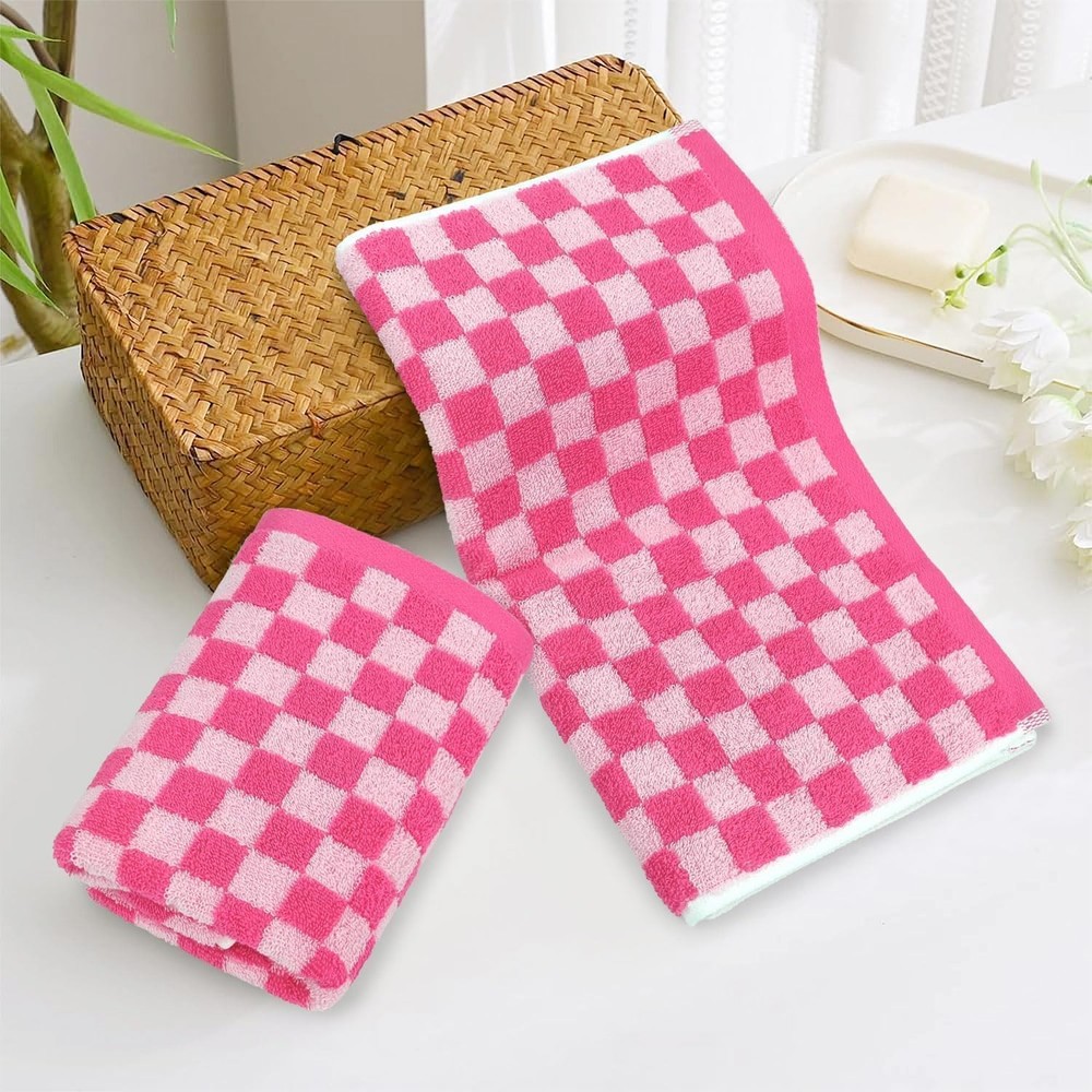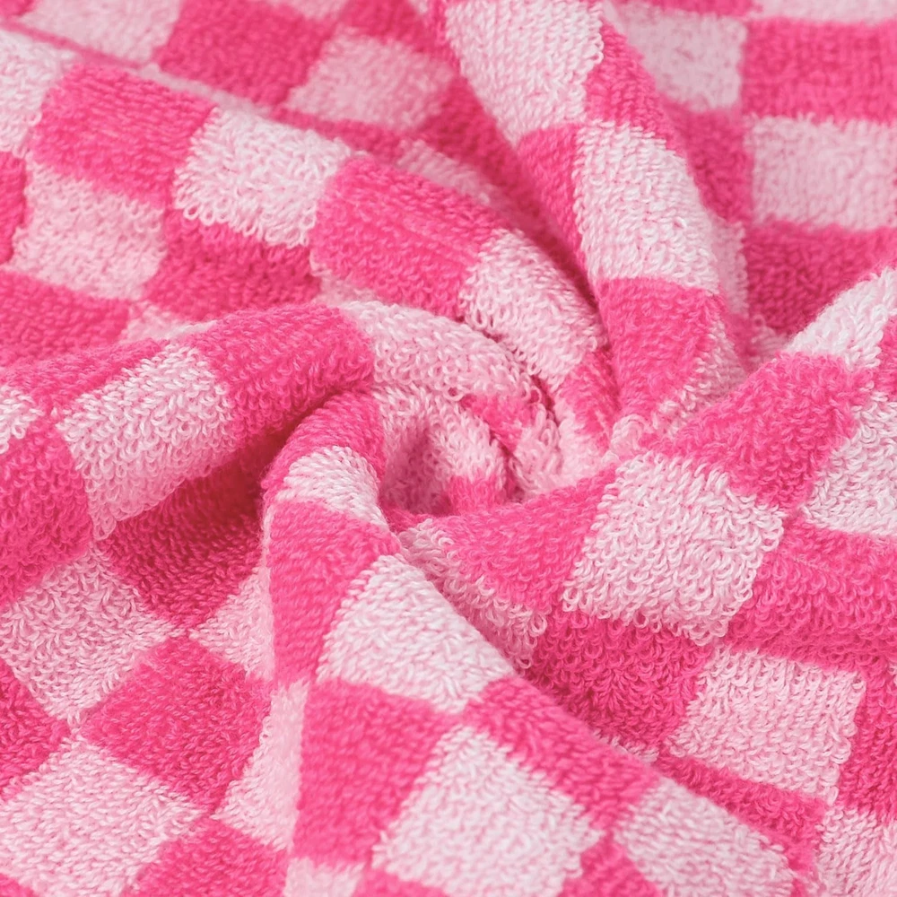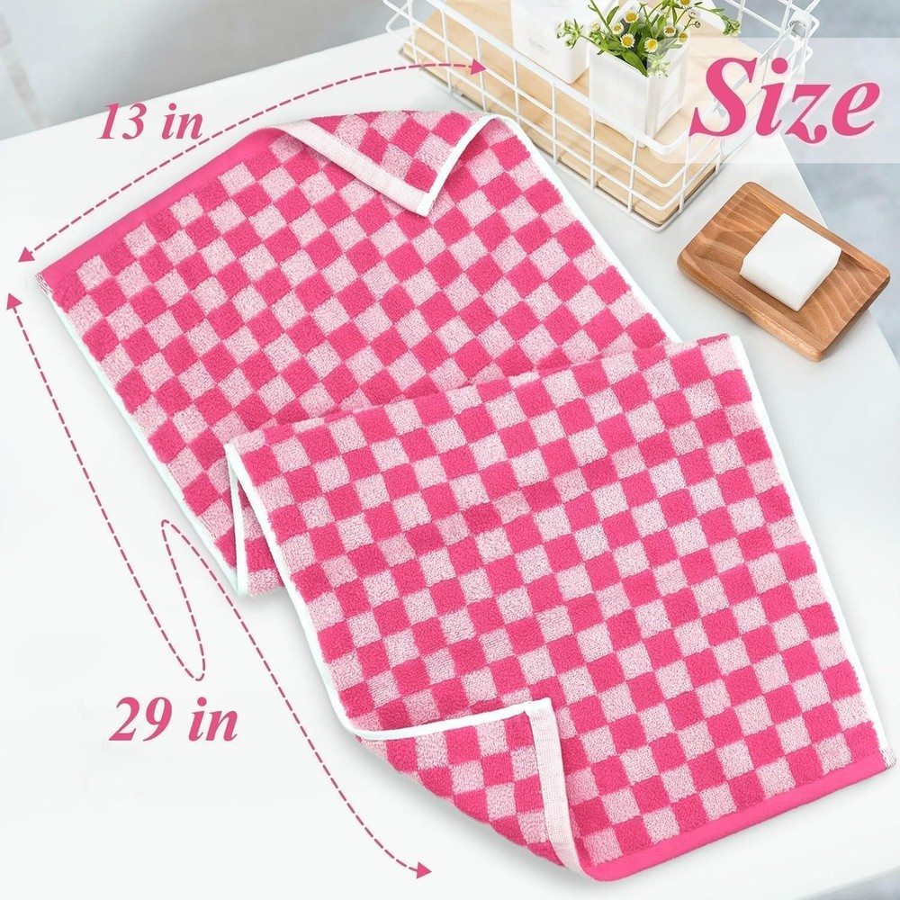 Hot Pink Checkered Towels for Bathroom Tired of plain towels? Our hand towels feature a bright and energetic pink checkered design that brings life and personality to any room. Perfect for the bathroom, kitchen, or guest room decor, these cute towels instantly create a lively, cheerful atmosphere. Their vivid colors hold up wash after wash, ensuring your home looks fresh and inviting. Bathroom Hand Towels - Made for Everyday Luxury With these cotton hand towels, you're not just drying your hands - you're treating yourself to a little luxury every time. Made from 100% cotton with a plush 460 GSM thickness, these face towels are not only super soft but also absorbent, wicking away moisture instantly. Perfect for when you're stepping out of a hot shower, washing your face in the powder room, or quickly drying your hands in the kitchen. Medium Size for Every Occasion Measuring 13" x 29", these small hand towels are designed to meet all your needs. Ideal for bathroom, kitchen, gym, pool, salon, and dorm. They’re lightweight and easy to carry, so toss one in your gym bag, bring it to your next yoga class, or even pack it for a weekend travel! These quick dry towels are versatile and ready to go wherever you do. Perfect Gifts for Friends, Family, or Yourself If you're looking for a gift that's both style and practical, the 4-piece bathroom hand towel set is a fantastic choice. Ideal for housewarming parties, weddings, birthdays, holidays, spa days, or just as a little something to brighten someone’s day, these hot pink towels will be loved by anyone who enjoys a splash of color and luxury in their everyday routine. Pop of Hot Pink Fun: Bored of basic? These hot pink checkered hand towels bring instant trendy - turn your bathroom or kitchen into a vibrant, chic space. Who knew drying your hands and body could feel so... wonderful Super Soft & Absorbent: Made from 100% cotton and 460 GSM in thickness, these bathroom towels offer a plush, soft touch and quickly absorb moisture. They are ideal for adding luxury and a quick-dry feel to your daily routine Perfect Size, Endless Uses: Each hand towel measuring 13" x 29" is versatile enough for every need, whether indoors or out. Need to washing your face? Easy. Wipe up a spill? Done. Add style to your guest room? You bet! Stylish Gifts Idea: Looking for a gift that screams "aesthetic but functional"? The cute hand towel set is a perfect pick. Great for housewarmings, birthdays, weddings, Thanksgiving Day, or just treating yourself Durable and Built to Last: Fade resistant, low lint, and finely sewn for a fresh look wash after wash. Easy care: machine washable, wash with similar colors, tumble dry on low. Don’t bleach and avoid sharp objects to prevent unraveling
