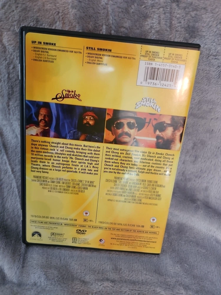 Experience the classic comedic duo of Cheech and Chong in this DVD double feature. Directed by Lou Adler, this 1983 release from Paramount Catalog includes the movies "Up in Smoke" and "Cheech and Chong's Still Smokin'." Starring Tommy Chong and Cheech Marin, this R-rated comedy is a must-have for any fan of the genre. The DVD format is NTSC and comes in a tall/DVD case. The aspect ratio is 16:9 and the language is English. The region code is DVD: 1 (US, Canada...). Get ready to laugh out loud with this hilarious contemporary comedy.