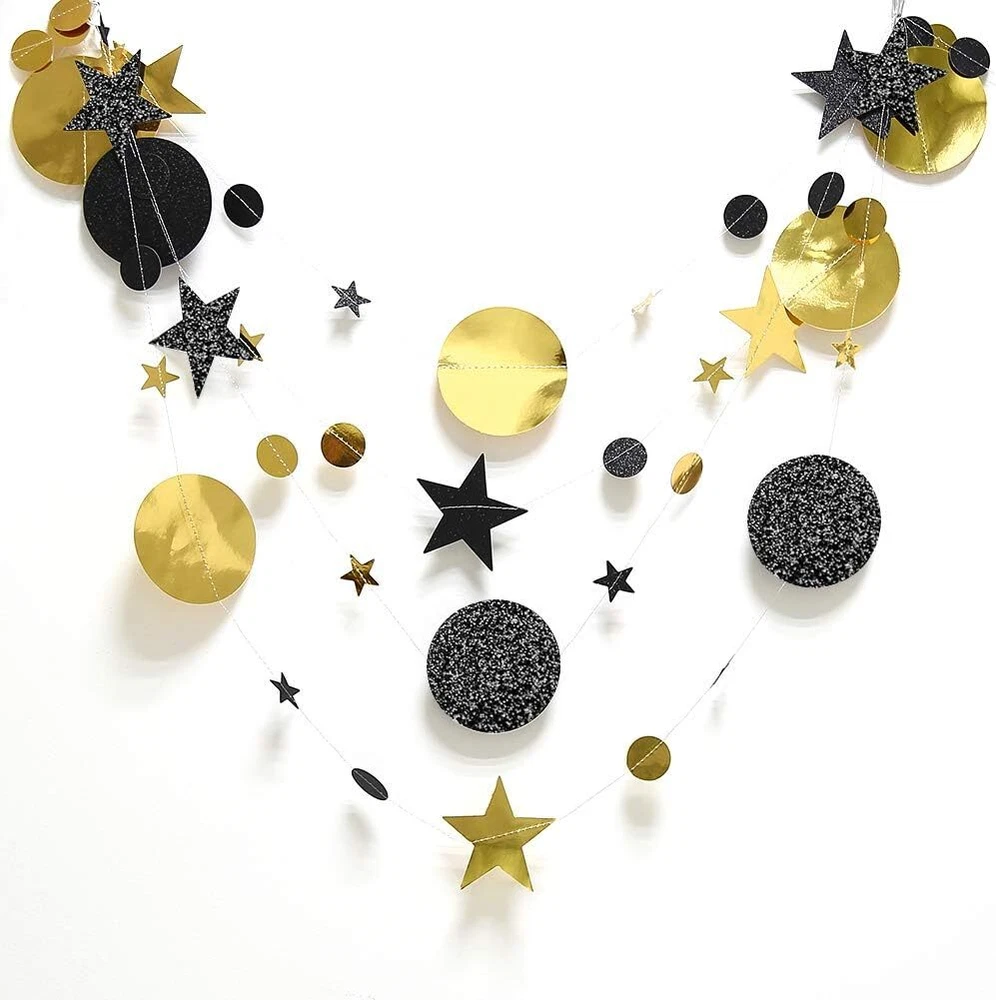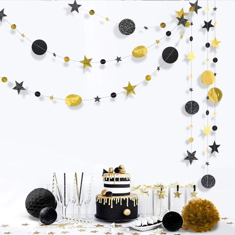 Cheerland Black Gold Party Decorations Moon Star Garland Hanging Product Details Brand: Cheerland Color: Gold Black Material: Paper Item Length: 468 Inches Is Artificial Garland: No ·Package Includes: 3 strings of 13 feet glittering and shiny black gold star and moon circle garlands. Totally 39 ft. The biggest paper circle is 3.5 inches in diameter. ·Black Gold Party Decorations: The black and gold stars and moons streamer made of glitter and shining card paper sway in the breeze and reflect light from all angles. These garlands are gorgeous party decorations to create a elegant and classy atmosphere at home or any festive event. ·Brilliant Decor for Most Occasions: These garlands are perfect decorations for most parties and celebrations such as wedding, engagement, bachelorette, bridal shower, baby shower, christening, birthday/Bday, sweet 16, graduation, retirement, Christmas and NYE New Year Eve, space themed parties, galaxy themed, proms, homecoming, fantasy themed, halloween, masquerade, galactic themed party, star wars party. They are also good ornaments for Islamic celebrations for Ramadan, Hari Raya and EID. Easy to Use: NO DIY needed. Unravel the strings with care to avoid tangling. Just hang them or stick them on wall, window, furniture, from ceiling or as background, backdrop of photo booth. Easy to remove and store for future reuse. Cheerland is an established brand of party decorations & supplies. We excel at creating novel designs and manufacturing quality products to suit your decoration needs. Come visit our shop often, you will surely find some interesting add-ons for your home and parties.