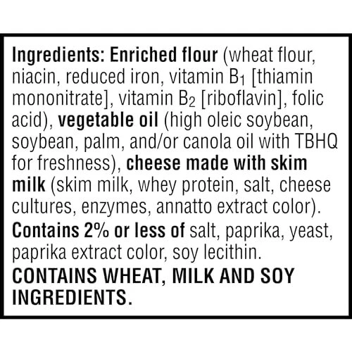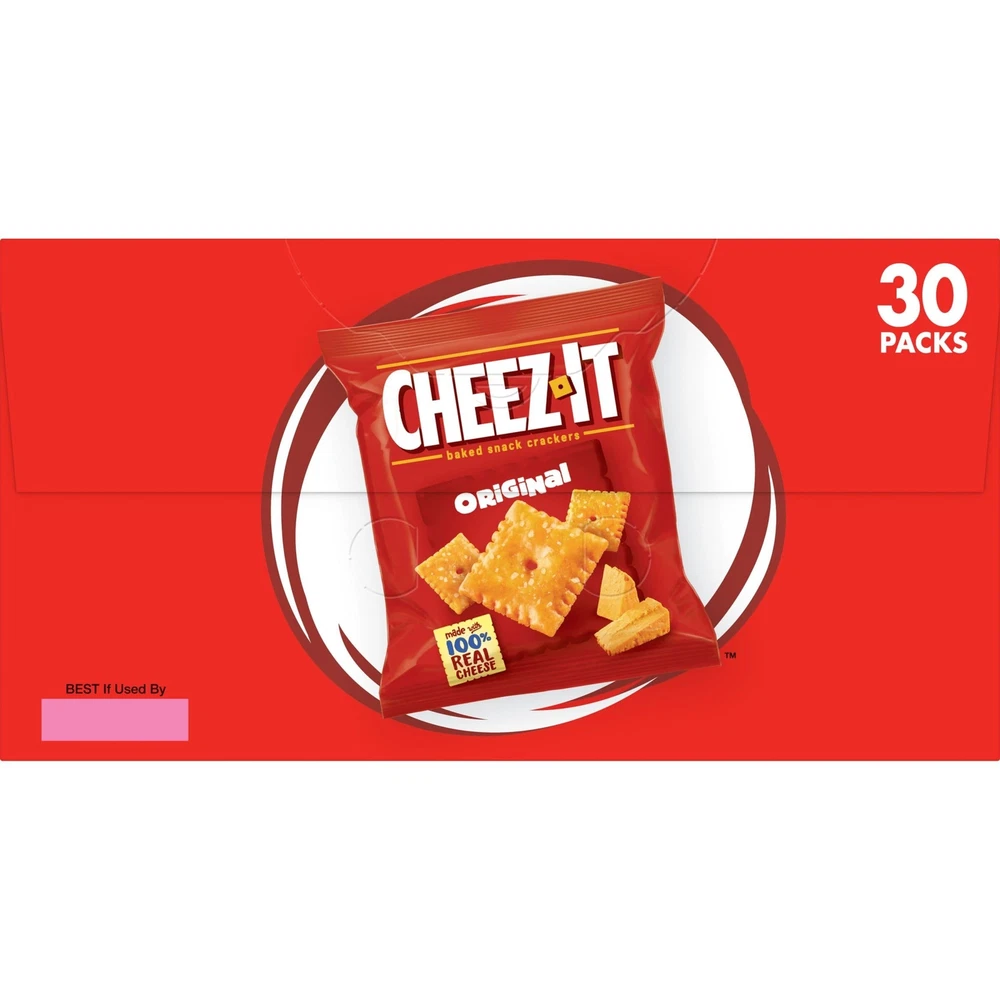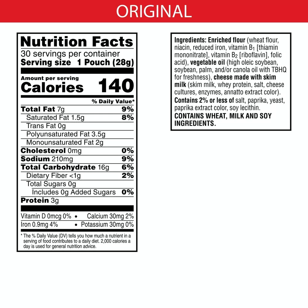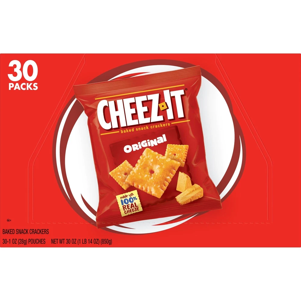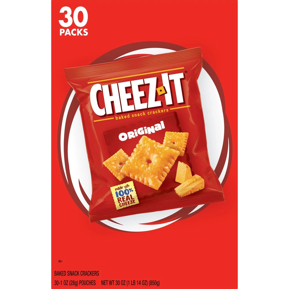 Outrageously cheesy and perfectly portable, these pouches of baked snack crackers contain deliciously crunchy little crackers that have captured cheese-lovers for decades. Discover a crowd-favorite snack made with 100% real cheese baked to crispy perfect for an irresistible taste in every crunchy bite. Each lightly salted crisp is loaded with a burst of cheesy flavor; baked snack crackers are an on-the-go fan-favorite for game night, school snacks, family movie nights, late-night snacking, and so much more, the cheesy options are endless. Delicious for all ages, grab a pouch of Original crackers for every family snacking moment. Whether you're packing them in school lunches, grabbing some for the office, or taking along on a road trip, you'll find a delicious, crisp snack that is filled with big cheese flavor. It’s no wonder that these bite-sized crackers have become a crowd-favorite, bringing smiles and that urge for just one more handful. On-the-go snack pouches each packed with deliciously cheesy, light and crispy snack crackers made with 100% real cheese and a sprinkle of salt Ignite cravings with the crunchy bite and bold cheese flavor found in each and every cracker; Want It, Need It, Made with 100% real cheese aged for a bold taste; Kosher Dairy; Contains wheat, milk, and soy ingredients An on-the-go snack; Ideal for road trips, lunch snacks, at the game, or as an afternoon snack; Pack in lunchboxes and backpacks Includes 1, 30oz box containing 30, 1oz pouches of ready-to-eat baked snack crackers; Packaged for freshness and great taste