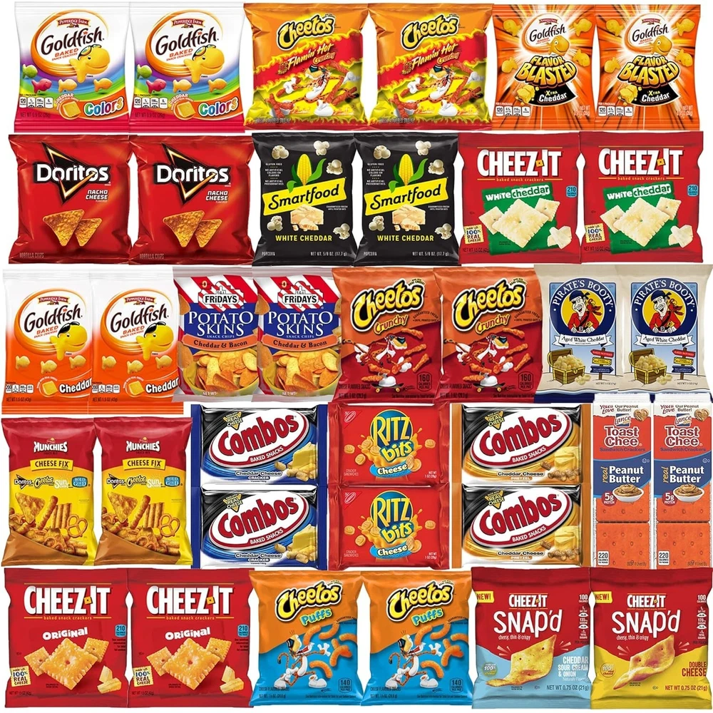 Cheese Crackers and Cheese Snacks Variety Pack Assortment Sampler Bulk Care Package 36 Count 's cheesy variety pack is a convenient and economical way to buy all of your favorite crackers and snacks. With 36 packs, this purchase gives you plenty of snacks to last a while. Stock up your pantry, slip in your bag, or fill up your office desk to share with coworkers and friends. The variety packs makes on-the-go snacking easy with individual serving sizes. A quick and convenient treat, great for trips, parties, school, holidays and care packages. This great package includes all of your favorites to satiate any craving, from cheese to peanut butter, sweet to salty and everything in between. It includes all of the tastiest products such as Lance, Doritos, Cheetos, Ritz, Frito-Lay, Pepperidge Farm, Combos, Cheez-Its, Smartfood and Fridays. Each package contains 36 single serve bags of fresh cheese crackers and cheese snacks individually wrapped for portion control. Perfect for kids and adults too. Assortment includes 2 each of: Lance ToastChee Peanut Butter, Pirate's Booty Aged White Cheddar Puffs, Goldfish Colors Cheddar, Goldfish Flavor Blast, Goldfish Cheddar Crackers, Cheez-It Original, Cheez-It White Cheddar, Cheez-It Snap'd, Doritos Nacho Cheese, Cheetos Crunchy, Cheetos Puffs, Cheetos Flamin' Hot Crunchy, Smartfood White Cheddar Popcorn, Munchies Snack Mix Cheese Fix, Ritz Bits, Combos Cheese Cracker, Combos Cheddar Cheese Pretzel, Friday's Potato Skins Cheddar & Bacon Looks like a snack. 's variety packs make on-the-go snacking easy with single-serve portions of fun!