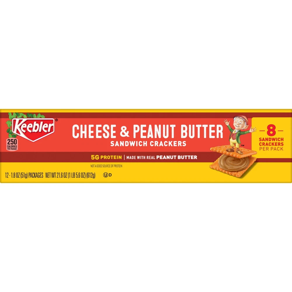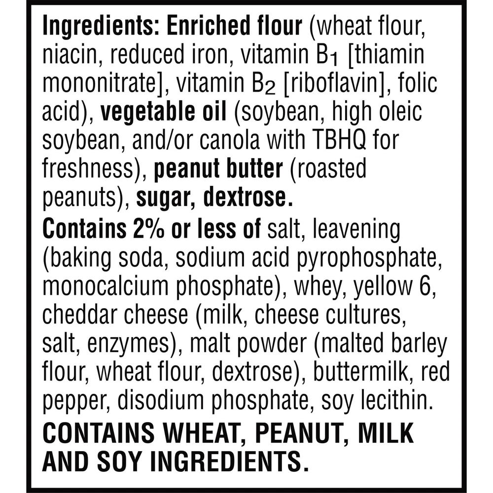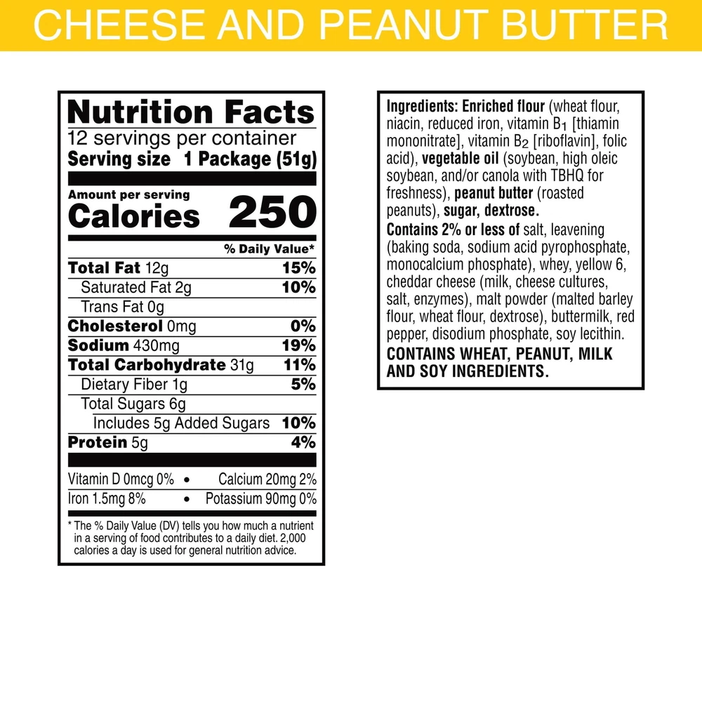 Light and buttery cheese-flavored crackers made with real peanut butter and no high fructose corn syrup. Cheese and Peanut Butter Sandwich Cracker Snack Packs are a satisfying choice for any occasion. Conveniently packaged to fit your busy lifestyle, simply grab a pack and go. Deliciously crafted, try these crackers as a standalone snack or paired with soups, salads and other foods. Add them to a party platter or lunch, and keep them on hand for a simple snack at school, work, or home. Shelf-Stable. Cheese and Peanut Butter Sandwich Crackers, Single Serve Snack Crackers, 12 Count: Light, flaky, cheese-flavored sandwich crackers made with delicious real peanut butter filling for easy snacking at home, school, work, and more; Shelf-Stable The peanut butter in our tasty sandwich crackers is made with roasted peanuts; No high fructose corn syrup; Contain wheat, milk, peanuts, and soy ingredients A family-favorite, on-the-go snack that's perfect for both kids and adults Conveniently packaged and ready to travel; Pop a pack in your kid's backpack or lunchbox; Stow some in your tote bag, car, or desk for anytime snacking Includes one, 21.6oz tray containing 12, 1.8oz Big Snack Pack Sandwich Crackers; Packaged for freshness and great taste Ready to Eat