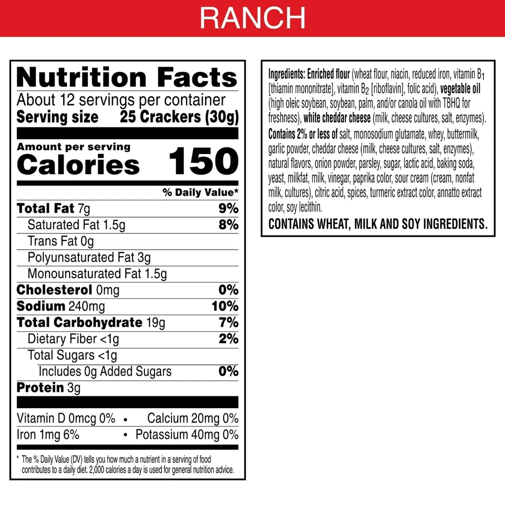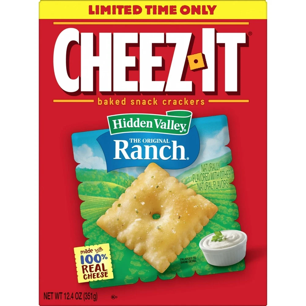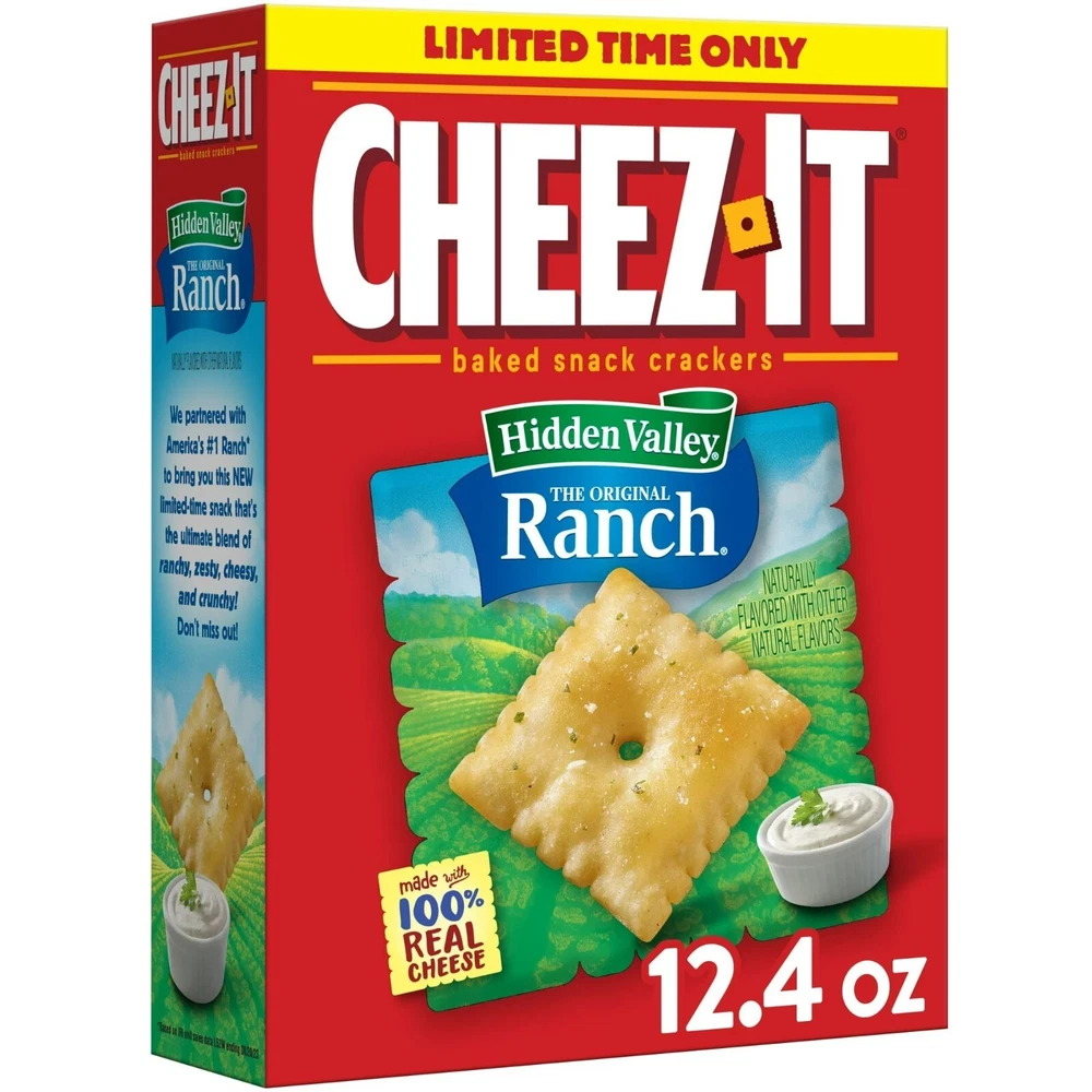 Ranch lovers, unite! America's #1 Ranch* brings its signature taste to Cheez-It crackers. Cheez-It Hidden Valley Ranch crackers are the perfect bite-sized snack bursting with the iconic flavor of America's favorite dressing. Discover a new, crowd-favorite snack made with 100% real cheese baked to crispy perfection for an irresistible ranch taste in every crunchy bite; Cheez-It baked snack crackers are a fan-favorite for game night, school snacks, family movie nights, party spreads, late-night snacking, and so much more, the cheesy options are endless. Delicious for all ages, grab a box of Cheez-It Hidden Valley Ranch crackers for every family snacking moment. Whether you're packing them in school lunches, grabbing some for the office, or taking along on a road trip, you'll find a delicious, crisp snack that is filled with big ranch flavor. It’s no wonder that these bite-sized crackers have become a crowd-favorite, bringing smiles and that urge for just one more handful. •We partnered with America's #1 Ranch* to bring you deliciously cheesy, light and crispy snack crackers with zesty ranch flavor •The ultimate blend of ranchy, zesty, cheesy, and crunchy; Ignite cravings with Cheez-It Hidden Valley Ranch crackers only for a limited time •Made with 100% real cheese aged for a bold taste; Kosher Dairy; Contains wheat, milk, and soy ingredients •Enjoy a zesty, satisfying crunch at family movie nights, for lunch snacks, snack spreads, or as an afternoon snack; Pack in lunchboxes and backpacks •Includes 2, 12.4oz box of ready-to-eat baked snack crackers; Packaged for freshness and great taste •Limited edition, limited time only