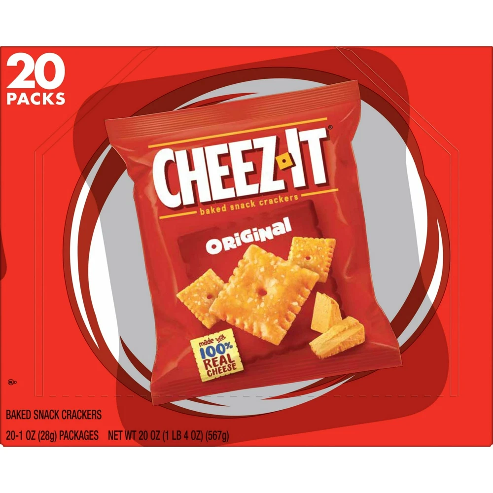 Cheez-It Original Cheese Crackers, Baked Snack Crackers, 20 Count New Product details:- Outrageously cheesy and perfectly portable, these pouches of Cheez-It baked snack crackers contain deliciously crunchy little crackers that have captured cheese-lovers for decades. Discover a crowd-favorite snack made with 100% real cheese baked to crispy perfect for an irresistible taste in every crunchy bite. Each lightly salted crisp is loaded with a burst of cheesy flavor; Cheez-It baked snack crackers are an on-the-go fan-favorite for game night, school snacks, family movie nights, late-night snacking, and so much more, the cheesy options are endless. Delicious for all ages, grab a pouch of Cheez-It Original crackers for every family snacking moment. Whether you're packing them in school lunches, grabbing some for the office, or taking along on a road trip, you'll find a delicious, crisp snack that is filled with big cheese flavor. It’s no wonder that these bite-sized crackers have become a crowd-favorite, bringing smiles and that urge for just one more handful. CONTAINS WHEAT, MILK AND SOY INGREDIENTS. Shelf-Stable. Cheez-It Original Cheese Crackers, Baked Snack Crackers, 20 Count: On-the-go snack pouches each packed with deliciously cheesy, light and crispy snack crackers made with 100% real cheese and a sprinkle of salt; Shelf-Stable Ignite cravings with the crunchy bite and bold cheese flavor found in each and every Cheez-It cracker; Want It, Need It, Cheez-It Made with 100% real cheese aged for a bold taste; Kosher Dairy; Contains wheat, milk, and soy ingredients An on-the-go snack; Ideal for road trips, lunch snacks, at the game, or as an afternoon snack; Pack in lunchboxes and backpacks Includes 1, 20oz box containing 20 packs of ready-to-eat cheese crackers; Packaged for freshness and great taste Ready to Eat Packaging Type is Regular and Container Type is Cardboard