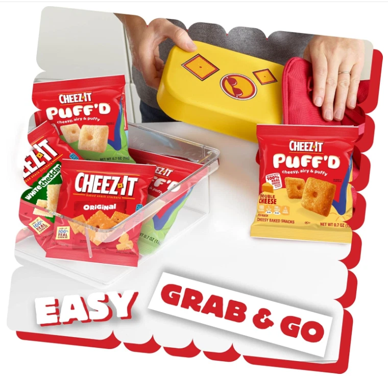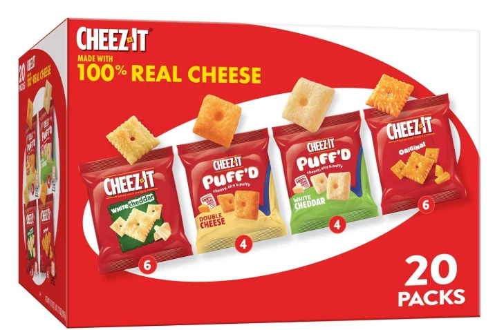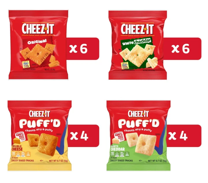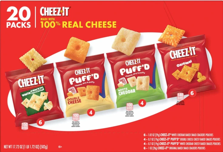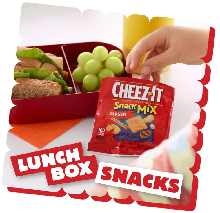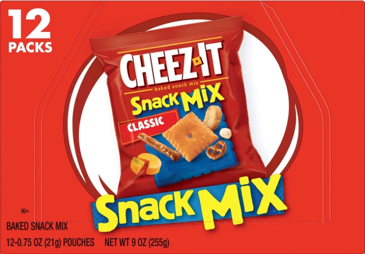 Cheez-It Snack Mix, Lunch Snacks, Office and Kids Snacks, Classic, 9oz Box (12 Packs) About this item : · A perfectly seasoned snack mix of crackers made with real cheese, salty pretzels, mini toasted bread slices, savory wheat squares, and cheese flavored rice balls · Our irresistible baked snack mix is great for sharing and makes a delicious anytime snack that pleases both kids and adults · Made with 100% real cheese aged for a bold taste; Contains wheat, milk, and soy ingredients; Kosher dairy · Convenient caddy box for grab-and-go snacking; Individually wrapped; Stock your home pantry, store for treats at school, in lunchboxes or tote bags for anytime snacking · Includes 1, 9-ounce caddy box of 12, 0.75-ounce pouches of ready-to-eat snack mix; Packaged for freshness and great taste Product Description: Satisfy your snack time cravings with a delicious handful of Cheez-It Snack Mix Classic. This snack mix features a tasty combination of baked snack crackers made with 100% real cheese, salty pretzels, mini toasted bread slices, savory wheat squares, and cheese flavored rice puffs that have been baked to crispy, crunchy perfection. This snack mix is perfectly sized for on-the-go snacking, as a flavorful addition to a packed lunch, or even just a quick bite around the house. Toss a pouch in your tote for a long commute, bring some snack mix in the car for a road trip, or stash them in your desk at the office for convenience. You can spice up everyday, out-of-the-home activities like field trips, camping, hiking, trips to the park, picnics, outdoor concerts, errands, and more by bringing along our Classic snack mix. No matter where you enjoy it - you'll love the epically satisfying mix of flavors in every handful of Cheez-It Snack Mix Classic.