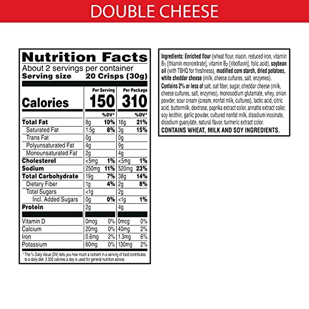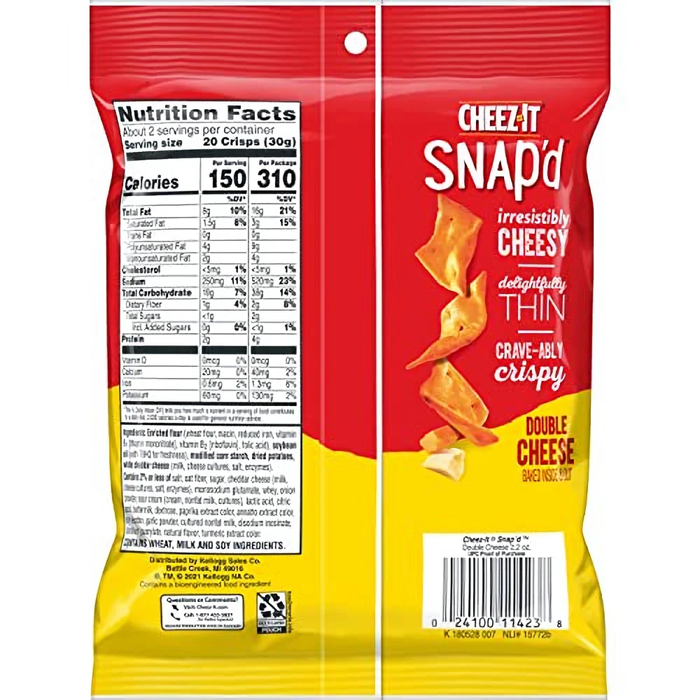 << The item is a Size 2.2 Ounce (Pack of 1) >> Make snack time more fun with Cheez-It Snap'd Double Cheese - the super thin and crispy cheesy baked snacks loaded with big cheese flavor. With 100% real cheese baked-in and sprinkled on top, Cheez-It Snap'd crackers are irresistibly cheesy. The Snap'd snacks are delightfully thin with a crispy snap for extra crunch in every bite. Cheez-It Snap'd snacks are perfect for celebrating game time, make a great addition to party spreads, cure late-night savory cravings and more - the cheesy options are endless. Pack your Snap'd snacks in school lunches or as an extra snack on-the-go. With double the cheesy zest for double the flavor and double the fun, this snack will tempt you with, ‘just one more bite.' You'll love the bold crunch and delicious, t 2.2 Ounce (Pack of 1) Make snack time more fun with Cheez-It Snap'd Double Cheese - the super thin and crispy cheesy baked snacks loaded with big cheese flavor. With 100% real cheese baked-in and sprinkled on top, Cheez-It Snap'd crackers are irresistibly cheesy. The Snap'd snacks are delightfully thin with a crispy snap for extra crunch in every bite. Cheez-It Snap'd snacks are perfect for celebrating game time, make a great addition to party spreads, cure late-night savory cravings and more - the cheesy options are endless. Pack your Snap'd snacks in school lunches or as an extra snack on-the-go. With double the cheesy zest for double the flavor and double the fun, this snack will tempt you with, ‘just one more bite.' You'll love the bold crunch and delicious, tasty flavor of real cheese in every perfectly-baked bite of Cheez-It Snap'd Double Cheese Cheesy Baked Snacks. Thin and crispy cheesy baked snacks with big cheese taste inside and out||Turn up the cheese volume with the satisfying crunch of Cheez-It Snap'd||Made with 100% real cheese; Kosher dairy, contains wheat, milk and soy ingredients||An anytime snack that makes a tasty bite at home or on the go; Enjoy while relaxing and watching TV, or add as a crunchy side to your sandwich||Includes 6, 2.2-ounce pouches of ready-to-eat cheesy baked snacks; Packaged for freshness and great taste