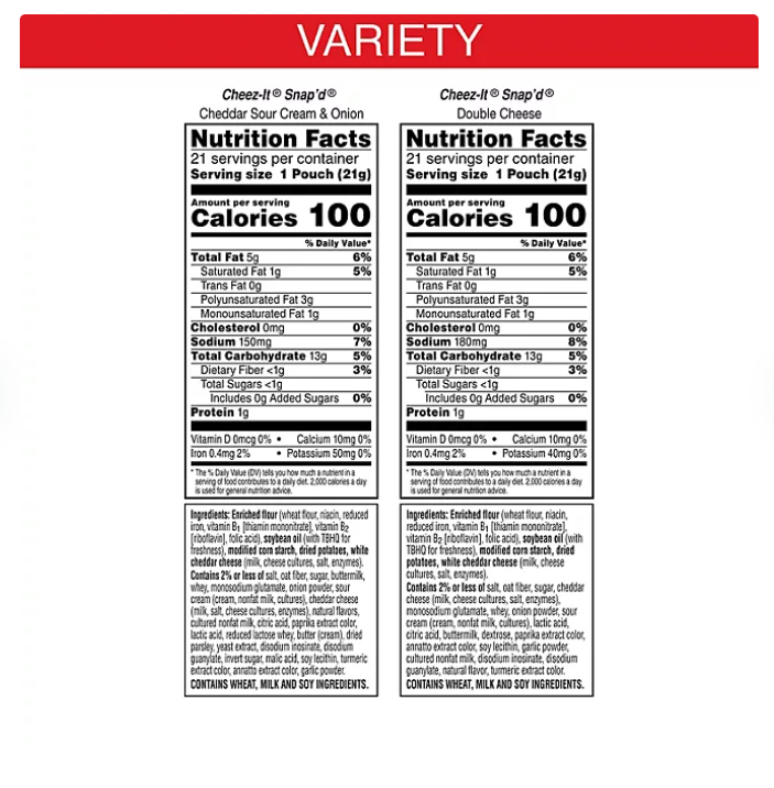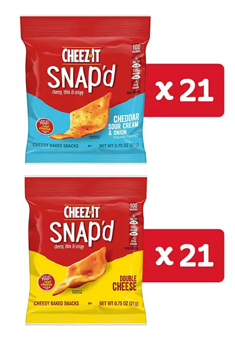 Flavorful Snack Time Companion Make snack time more fun with the bold cheesy flavor of Cheez-It Snap'd Cheesy Baked Snacks. This variety pack includes two exciting flavors: Cheddar Sour Cream and Onion and Double Cheese. Baked with 100% real cheese and topped with an extra sprinkle, Cheez-It Snap'd crackers offer an irresistibly cheesy experience. Thin, Crispy, and Delicious The Snap'd snacks are delightfully thin with a crispy snap for extra crunch in every bite. Perfect for celebrating game time, enhancing party spreads, or satisfying late-night savory cravings, Cheez-It Snap'd snacks offer endless cheesy options. The thin, crispy texture and bold flavor will tempt you with, ‘just one more bite.' Convenient and Versatile Pack your Snap'd snacks in school lunches or as an extra snack on-the-go. With double the cheesy zest for double the flavor and double the fun, these snacks are perfect for any occasion. You'll love the delicious, tasty flavor of real cheese in every perfectly-baked bite of Cheez-It Snap'd Cheesy Baked Snacks. A Legacy of Cheesy Goodness In 1921, Cheez-It pioneered the perfect cheesy, square snack for any occasion - and millions of people agreed. Although a few things have changed over the past 90 years, Cheez-It has kept its fans "sayin' cheese" by baking 100% real cheese into the same 1" x 1" cracker, proving that being square doesn't have to be boring.