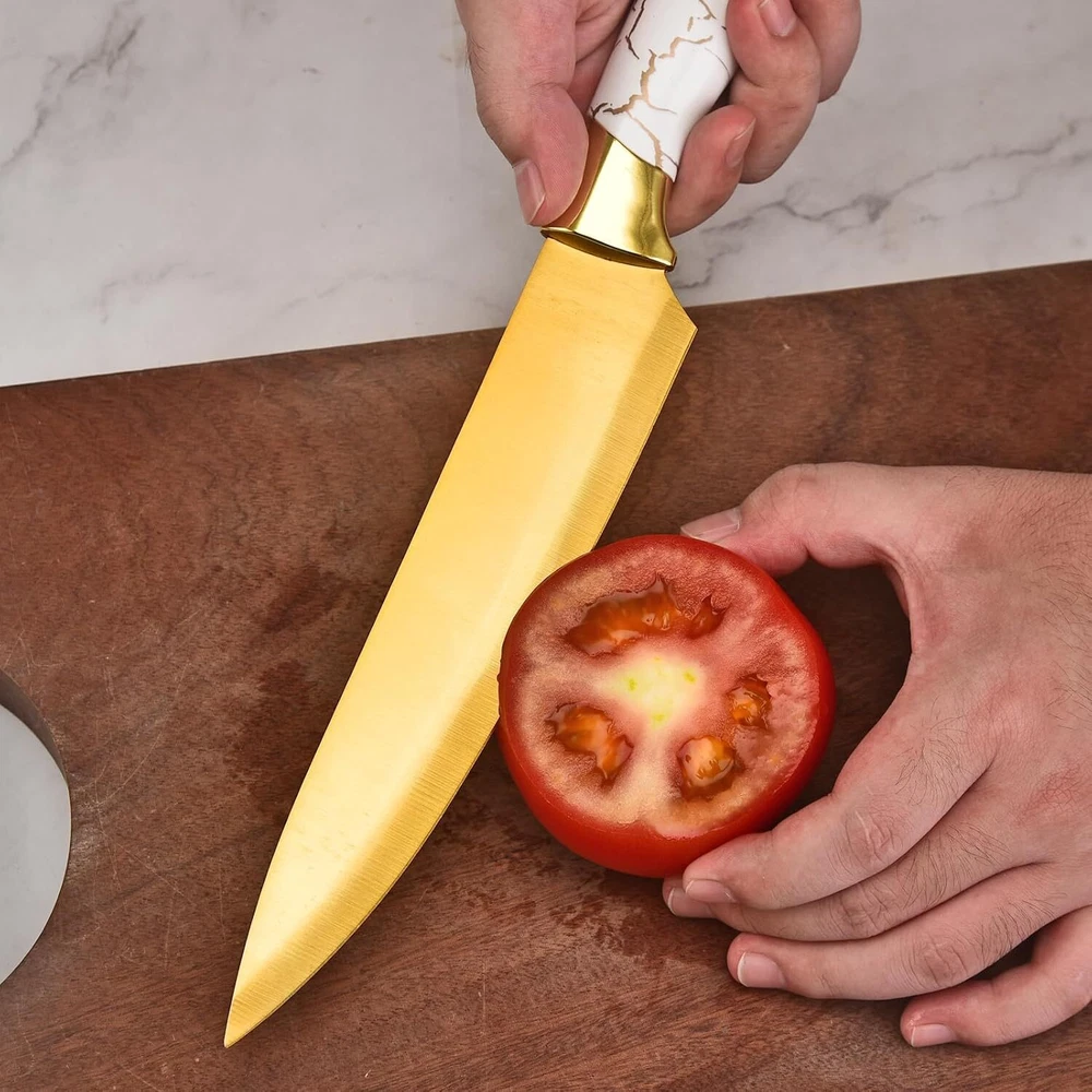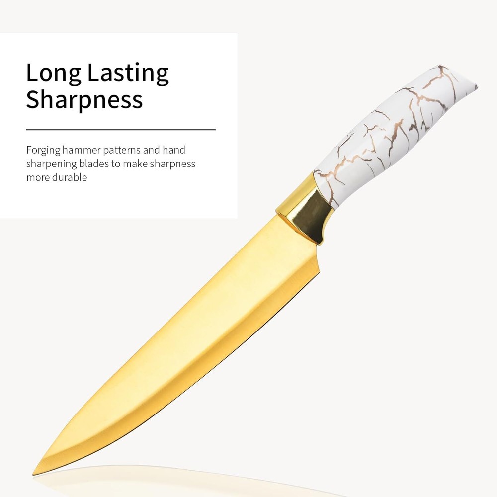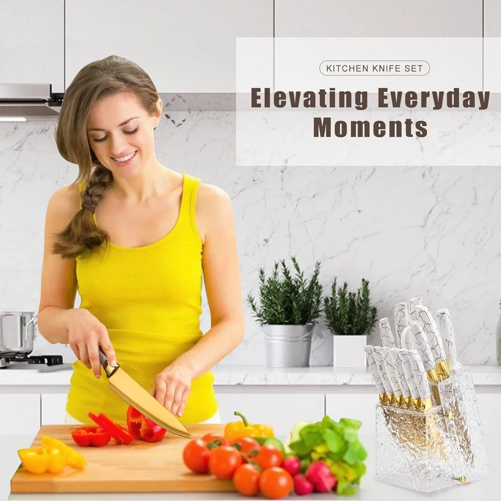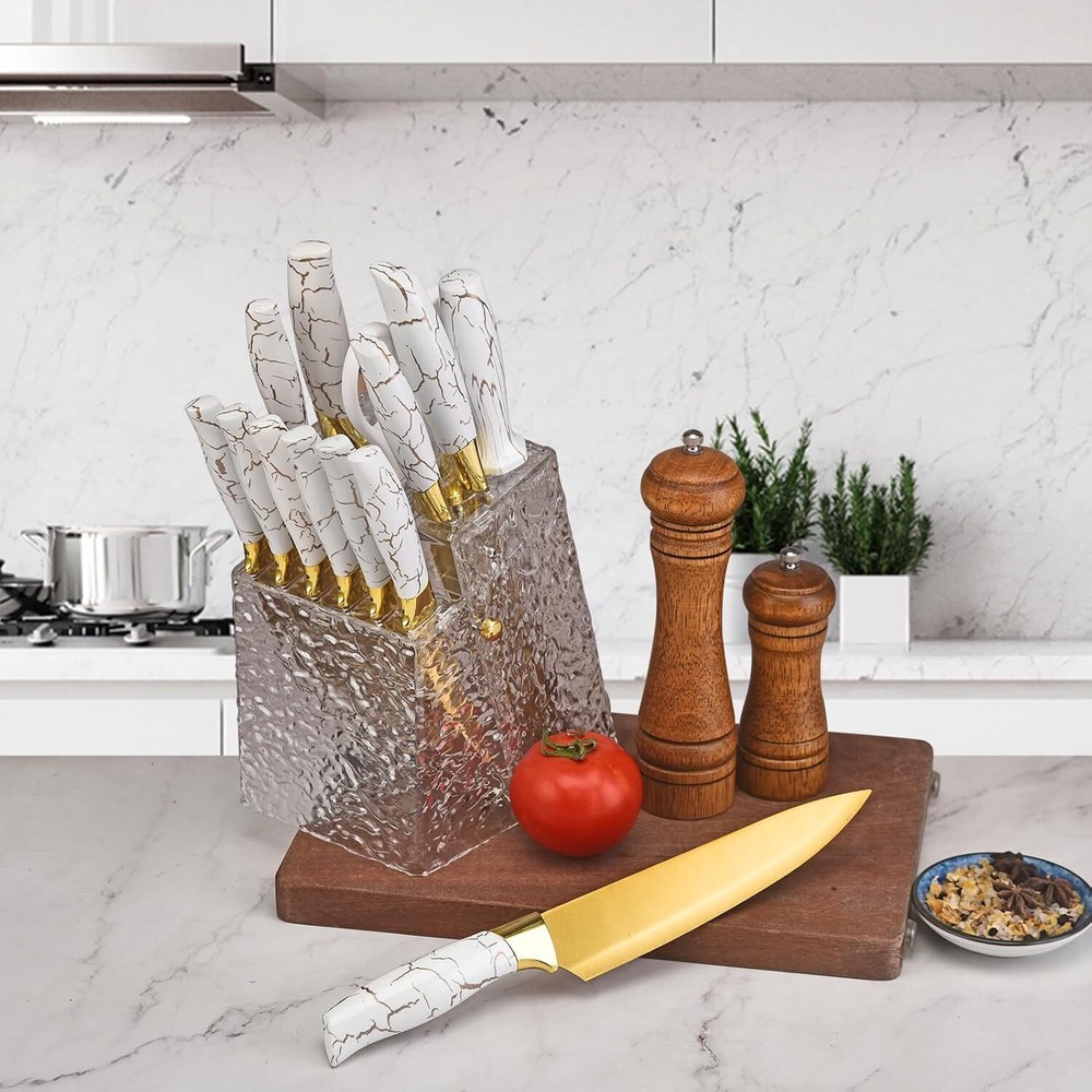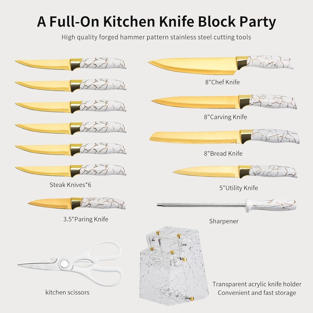 Product Description Kitchen Knife Set Non Stick Knives with Block, Serrated Steak Knife, Chef Knife, Bread Knife, Scissors, Sharpener, 14Pcs Stainless Steel Ultra-Sharp Cutlery Block Sets with Titanium Coated Blade A Full Knife Set for You - - This 14 Pieces knife set includes 8" chef knife, 8" carving knife, 8" bread knife, 3.5" paring knife, 5" fine edge utility knife, 6pcs 4.5" serrated steak knife, 1pcs kitchen shears, and thickened clear acrylic knife block with built-in sharpener. High-Quality Material to Cutting Items - - The kitchen knife set is made of premium high carbon stainless steel . Professional-level sharpness ensures precision cutting and easy to use. Stainless steel makes sure corrosion resistance and titanium enhances non-stick properties, which can withstand high-frequency use or use after long periods of idle. Outstanding Performance - - The handles are ergonomically designed to provide comfort and perfect grip. Best knife set for both professional and beginner. Easily cut anything (such as meat, bread, fruits, and vegetables) let you enjoy the fun of cooking, and it is also a beautiful decor to your kitchen. Colors Optional & Ideal Gift - Our knife set will come with a stand that is beautiful and space-saving. Makes it easy for you to pick up the knife you need. Colors for you, Perfectly adapted to all kinds of kitchen styles. Also can be a great gift option for family and friends on birthdays, weddings, anniversaries, housewarming days, etc. Easy To Clean - - After using the kitchen knife set, simply rinse quickly and wipe with a kitchen towel, (Take care when cleaning to prevent cutting fingers). It’s an essential and practical kitchen cutting tools, by the way if became dull after using for many times you can sharp it with a sharping. About Us We are a reputable seller with many years of experience selling on eBay. Our goal is to provide high-quality products and excellent customer service. Shipping Items will be shipped within 1-3 business days when we received payment. (Orders are not processed on weekends & holidays) Tracking information will be sent once item is shipped. Delivery time depends on destination and other factors Item is shipped to ebay address. Leaving correct address can minimize delay. For international shipping and shipping to Guam, Hawaii and Alaska, Please contact us before placing the order. International buyers please note: Import duties, taxes and charges are not included in the item price or shipping charges. These charges are buyer’s responsibility. We will try our best to reduce the risk of the custom duties. Local pick-up is unavailable at the moment. Contact Us We reply any email messages within 1 business / working days(off-duty at weekend). If you do not get a response from us, then please check your junk or spam mailbox. Our Business hours: Mon-Fri 9:00-18:00, UTC/GMT +8 hours. Please contact us either by clicking "contact seller" in the "purchase history" section or simply click "ask a question" at the bottom of this page. If you are unsatisfied with our item or service, please contact us before leaving any feedback. We are committed to resolve all issues in a friendly and satisfactory manner.