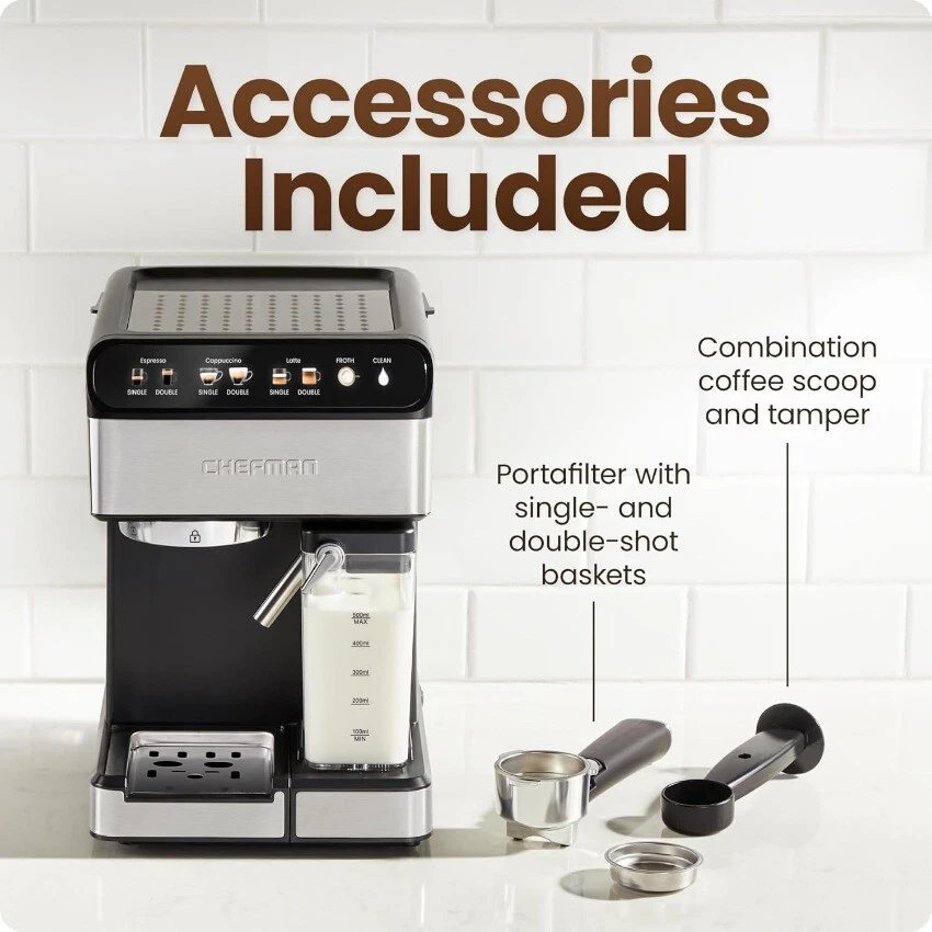 About this item BE YOUR OWN BARISTA: Bring the energizing taste of coffeehouse brews into your home with the gourmet Chefman Digital Espresso Maker! With a powerful 15-BAR pump and a built-in frother, you’ll be able to brew like a barista every morning. CAFÉ-QUALITY BEVERAGES: This 6-in-1 coffee machine creates all your favorite high-quality espresso beverages right in your kitchen. Enjoy single or double shots of espresso, cappuccinos, lattes, and more! This machine is more than just a coffee pot; it’s also a cappuccino machine and a latte maker. BREW WITH EASE: Make your coffee bar a staple stop in your morning routine. With simple one-touch operation, you can brew and froth your perfect cup of coffee with ease. Just fill the portafilter with your favorite ground espresso, choose your drink on the touch controls, and enjoy! LATTES AND CAPPUCCINOS: The built-in steam wand is ideal for silky espresso drinks. Unlike other espresso machines, the Chefman CaféMaster Pro automatically dispenses steamed milk directly into your mug. When you’re finished, easily remove the frother and store it in your fridge. 1.8-LITER WATER RESERVOIR: The spacious tank holds enough water to keep brewing espresso for all your brunch guests. Detach the reservoir from the machine to clean or fill directly in your sink. KEEP IT TIDY: Clean up with ease using the built-in internal cleaning function; just push and watch your espresso machine do the work. The sleek stainless-steel exterior cleans with the wipe of a damp cloth, no scrubbing needed. TRUSTED QUALITY: cETL approved with advanced safety technology for long lasting durability, & 1-year assurance provided by Chefman, so you can purchase worry-free - we've got your back! For information on how to use your product, scroll down for a PDF User Guide. 1350 Watts/120 Volts – RJ54-I-SV-AM 1---Please feel free to contact us through eBay Message ifrou have question,such as tracking number,shipping statusct.. 2---Please DON'T GIVE NEGARTIVE or NEUTRAL REVIEW or OPEN ANY CASES before contact us through ebay inbox. 3---Sometimes we may send small gift for you,please keep it if you get some gift from us.And hope you like it. 4---To offer best service,sometimes we will update the status of your order,please check your ebay inbox time by time. Anyway,thanks so much,enjoy shopping.