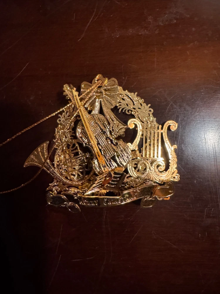 This is a round Christmas ornament by ChemArt, made of brass and handmade in the United States in 2014. The ornament features a musical instruments theme, plated in brass and includes the original packaging. It is part of the ChemArt Ornaments collection and depicts a Christmas Symphony.