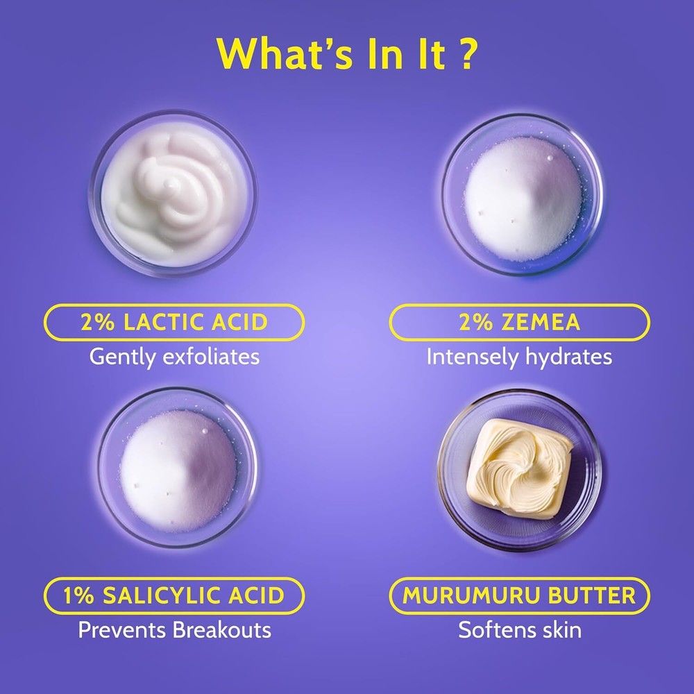 About this item DEEP CLEANSE: Our Exfoliating Body Wash deeply cleanses the skin, removing dirt/pollution residue and also helps even out the skin tone. NOURISHES THE SKIN: Our Exfoliating Body Wash is enriched with Lactic Acid that helps shed dead skin cells, making the skin unbelievably soft and supple. IMPROVES THE SKIN'S TEXTURE: Our body wash is enriched with Lactic Acid which gently exfoliates the dead skin cells, improving the overall appearance of the skin. It also evens out the skin tone and also helps fade age spots. WHY OUR EXFOLIATING BODY WASH: This body wash is vegan, cruelty-free, fragrance-free, silicones free, parabens free, gluten-free, mineral oil-free and dye-free. Our body wash is based on scientific research as we believe that people should understand the science behind what they apply to their skin and no other BS. SPECIALLY FORMULATED FOR YOU: Our Exfoliating Body Wash is perfect for anyone who has a rough, bumpy texture and looking to revive their dull and pigmented skin. Important information Safety Information: For external use only. Keep out of reach of children. Do not use on broken or damaged skin. In case of contact with eyes rinse off with water immediately. Ingredients: Purified Water, Sodium Lauryl Sarcosinate, Cocamidopropyl Betaine, Sodium Lauroyl Methyl Isethionate, Acrylates Copolymer, Glycol Stearate, Propanediol, Lactic Acid, Cocamide MEA, Betaine, 1% Salicylic Acid, Phenoxyethanol, Fragrance, Tocopheryl Acetate, Oryza Sativa (Rice) Bioscrub, Astrocarym Murumuru Bioscrub, Sodium Hyaluronate, Rice (Oryza Sativa) Phytoceramides, Konjac (Amorphophallus) Phytoceramide, Phospholipids, Sphingolipids, Sodium Hydroxide, Disodium EDTA. Directions: For external use only. Keep out of reach of children. Do not use on broken or damaged skin. In case of contact with eyes rinse off with water immediately. From the brand Previous page Next page Product Description Skincare, Science & Everything Nice! After All, What's Life Without A Little Chemistry? Previous page Exfoliating Bodywash & Hydrating Body Lotion Exfoliating Bodywash: AHA’s to exfoliate skin Hydrating Body Lotion: Hyaluronic acid to hydrate skin Next page Hydrating Kit Exfoliation Kit Brightening Kit Anti Aging Kit Previous page Next page Why Our Nourishing Body Wash Is Better Than Soap? Enriched with potent actives Every drop is untouched Made with ceramides Doesn’t dry out the skin Play Video