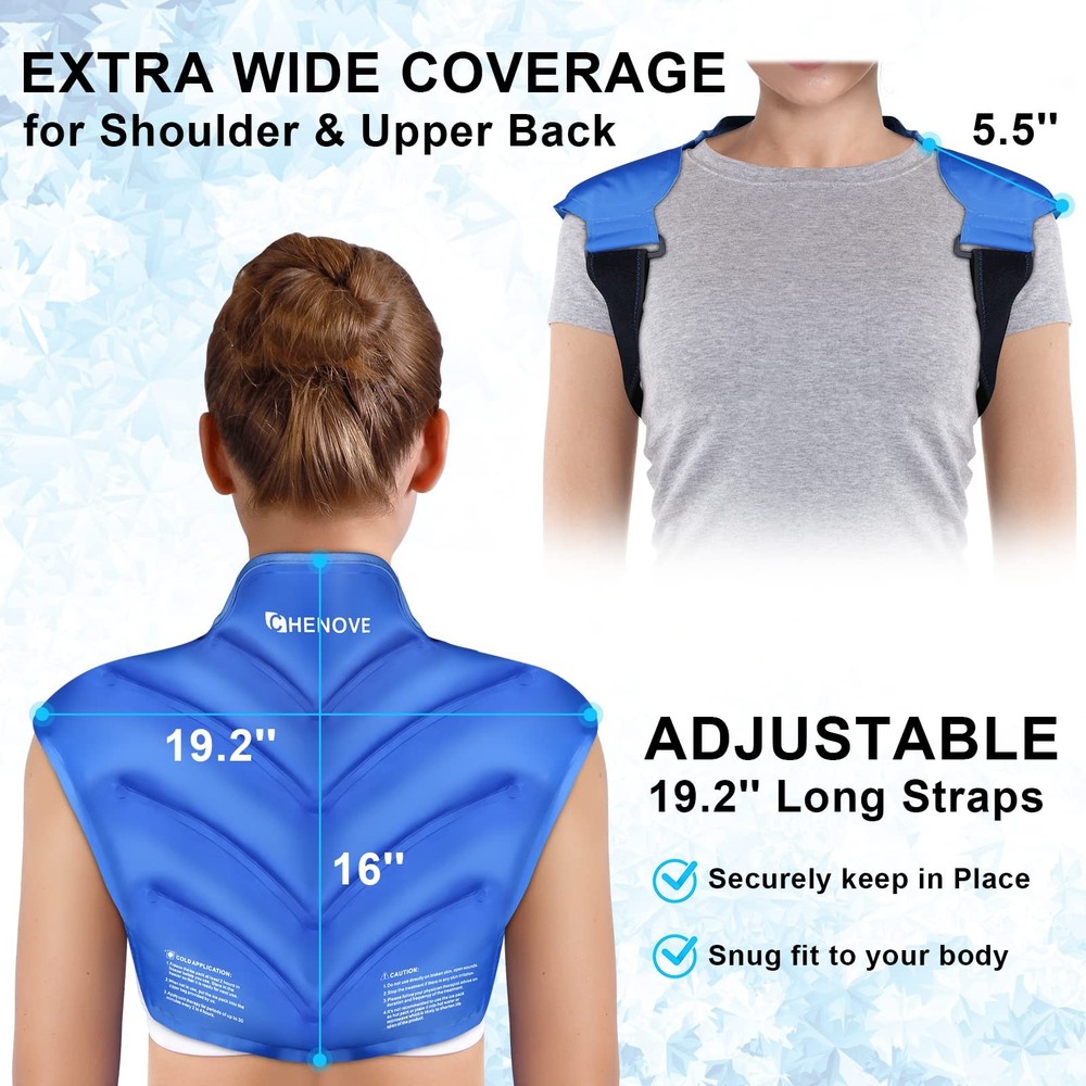 Chenove Ice Pack for Shoulders Upper Back Pain Relief with Strap, Neck and Sh... Description: Versatile and Comfortable Cold Therapy: The Chenove neck ice pack is a remarkable 3 - in - 1 cold therapy product designed for the shoulders, neck, and upper back. With its adjustable straps, it offers a customized and comfortable fit, adapting to different body shapes. It's perfect for post, exercise recovery or just a soothing cold treatment during your daily routine More Gel, Longer Lasting Cold: This ice pack upper back features a widened 19.2 × 16'' back area and is filled with 30 % more gel than regular ice packs. This extra gel ensures a longer lasting cold effect, so you can enjoy extended cold therapy sessions without having to refreeze it too often Innovative Dual Sided Fabric: The ice pack for neck and shoulders has an innovative dual fabric design. The plush side offers maximum comfort, making it easy to get used to the cold. The silky nylon side, on the other hand, allows for a deeper cold experience. You can choose the side that suits your preference at any time Hands Free and Secure: With two straps, this upper back ice pack allows you to wear it while doing various tasks. No matter where you are, at home, in the office, or even during the trip, this ice pack offers a convenient and hands free cold therapy solution. The straps keep the reusable gel ice pack firmly in place, providing a continuous cold treatment for your shoulders, back, and neck. Say goodbye to the hassle of holding an ice pack and hello to a more comfortable, pain free life Flexible When Frozen and Easy to Store: Filled with a low freezing point gel (-4 ℉), this ice pack remains flexible even when frozen, adapting well to the curves of your body. Its double sealed structure ensures it's leak proof. Plus, it comes with a protective bag for easy storage in the freezer