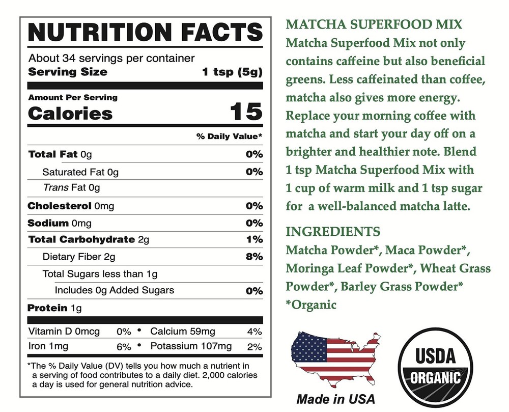 Cherie Sweet Heart Matcha Powder Green Superfood Mix, Non-GMO Mixed Greens, Plant Based, Focus & Energy, Organic Green Tea Powder, Natural Caffeine Drink Mix (6oz, 34 Servings) (Packaging May Vary) Product Details Brand: Chérie Sweet Heart Item Form: Powder Flavor: Matcha Tea Variety: Green Unit Count: 6.0 Ounce Package Dimensions ‏ : ‎ 8.7 x 8.62 x 1.81 inches; 6 ounces Item model number ‏ : ‎ OMSM-06 UPC ‏ : ‎ Manufacturer ‏ : ‎ Chérie Sweet Heart Units ‏ : ‎ 6.0 Ounce Best Sellers Rank: #52,483 in Grocery & Gourmet Food (See Top 100 in Grocery & Gourmet Food) #283 in Matcha Tea #283 in Matcha Tea Customer Reviews: 4.5 4.5 out of 5 stars 149 ratings MATCHA SUPERFOOD MIX: All natural, nutrient-dense blend of greens and brain-boosting superfoods to optimize your focus and productivity for hours. HIGH-GRADE GREEN TEA: Excellent source of natural caffeine, potassium, and the mix is high in vitamins and minerals. Matcha is high-grade green tea leaves that are stone ground into fine powder. EXCEPTIONAL FLAVOR: Contains NO stevia, sweeteners, fillers, thickeners, natural or artificial flavoring. This superfood can provide you with natural energy while giving your favorite dishes and drinks an exceptional flavor. ALL CERTIFIED ORGANIC INGREDIENTS: Organic matcha powder, organic maca powder, organic moringa leaf powder, organic wheat grass powder, organic barley grass powder. Matcha Superfood Mix not only contains caffeine but also beneficial greens. EASY TO PREPARE: Simply add one teaspoon to smoothies, juices, water, meals or snacks. It can be simply blended into hot water, making it easy to add a boost of health benefits to your everyday diet.