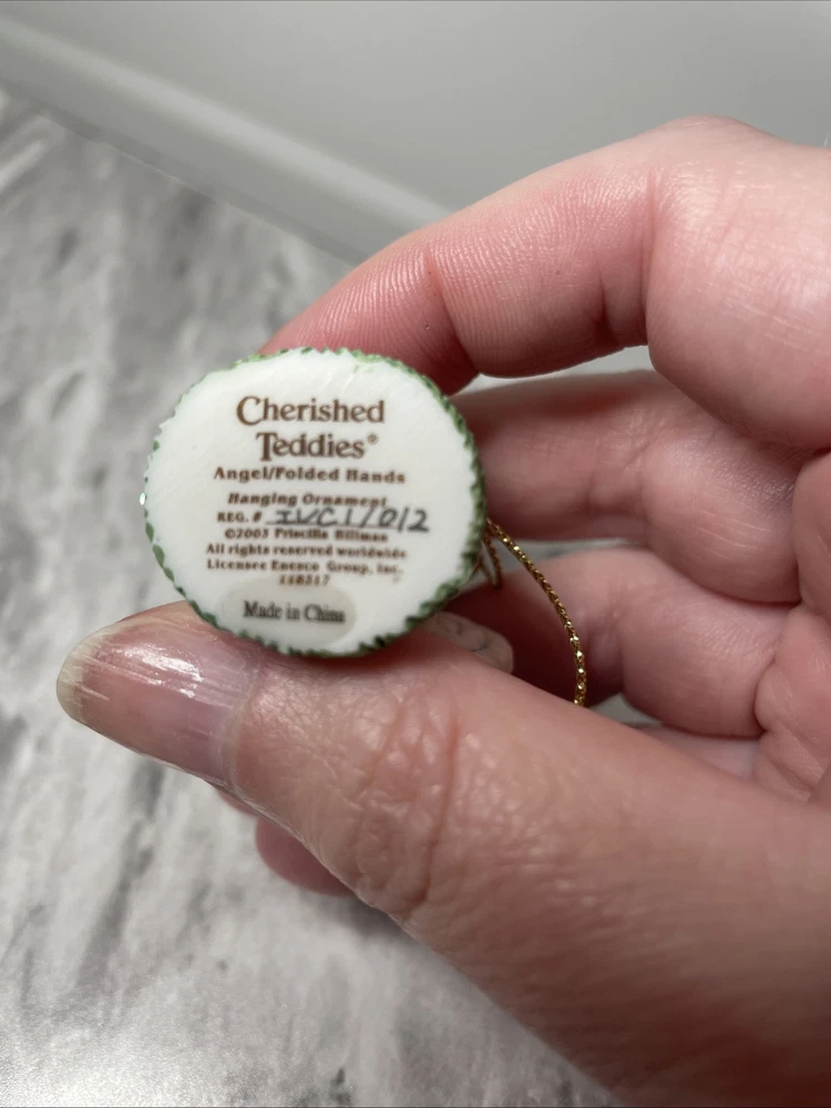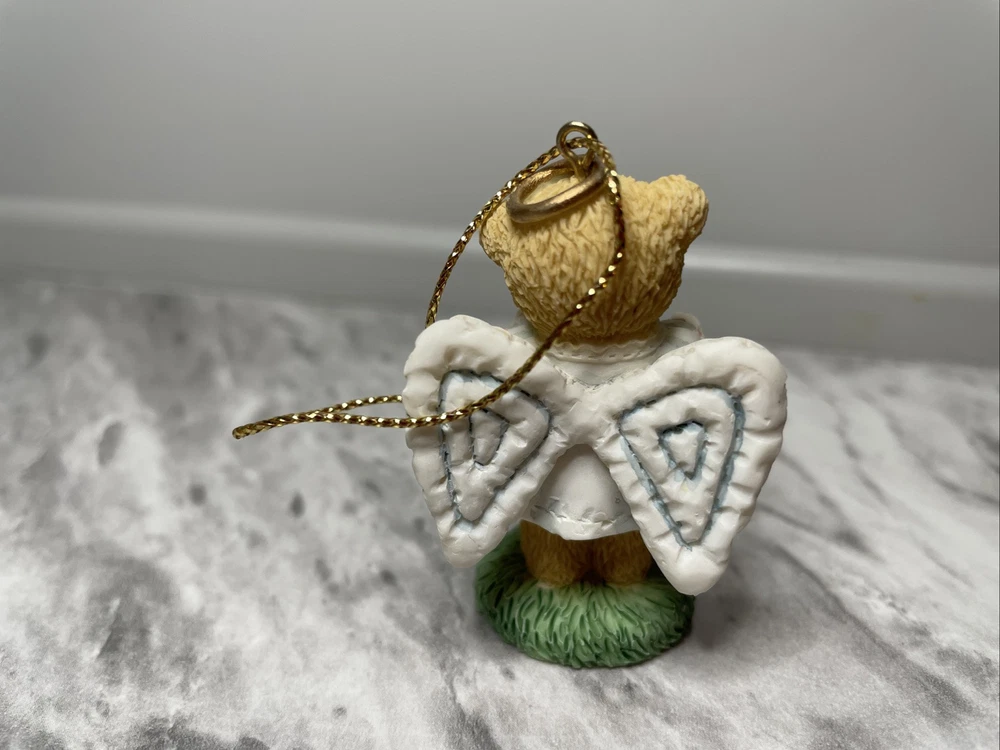 This is a Cherished Teddies Mini Ornament #118317 from Enesco. It is a small resin angel ornament designed for Christmas. Manufactured in 2003 in China, it features a hanging design and is part of a set.