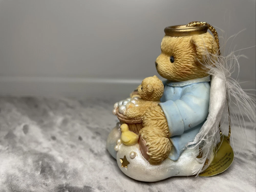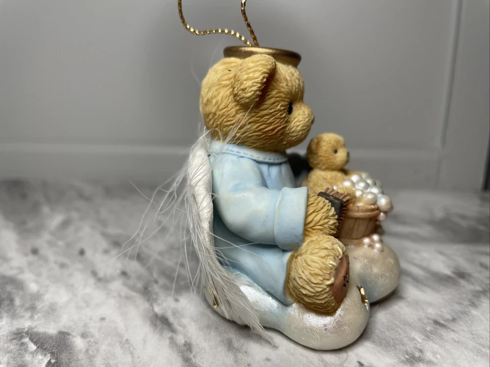 This Enesco Cherished Teddies figurine is a Christmas ornament featuring angels with the theme of "Wash Away Your Worries." Made of resin in 2001, this original piece is part of the Cherished Teddies collection. The figurine depicts an angel and is designed for holiday decoration.