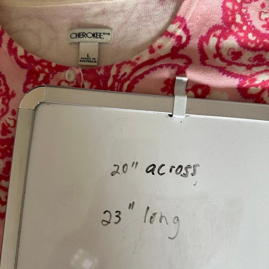 Cherokee Cotton Paisley Floral Cardigan Sweater Button Front Preppy Workwear L Size: LARGE Approx. measurements: 20" across (pit to pit), 23" long (shoulder to hem) Condition: Pre-loved and in gently used condition. Light wear. no stains, rips, or holes. - see all pics for any wear/condition Actual colors may vary. We do our best to ensure that our photos are as true to color as possible. However, due to photographic lighting sources, inconsistencies of various monitors settings, we cannot guarantee that the color you see accurately portrays the true color of the product. preppy, classic, casual, business casual, workwear, wear to work, chic, feminine, boho, cottage, cottagecore, grandma, grandmacore, academic, academia, light academia,