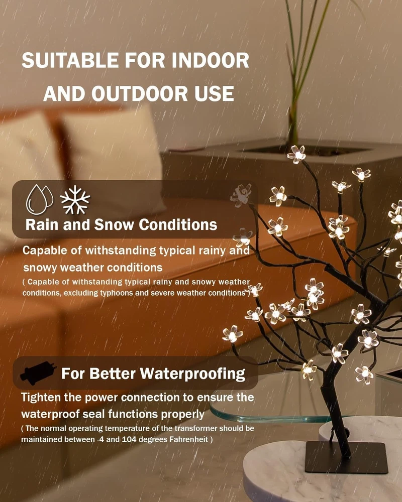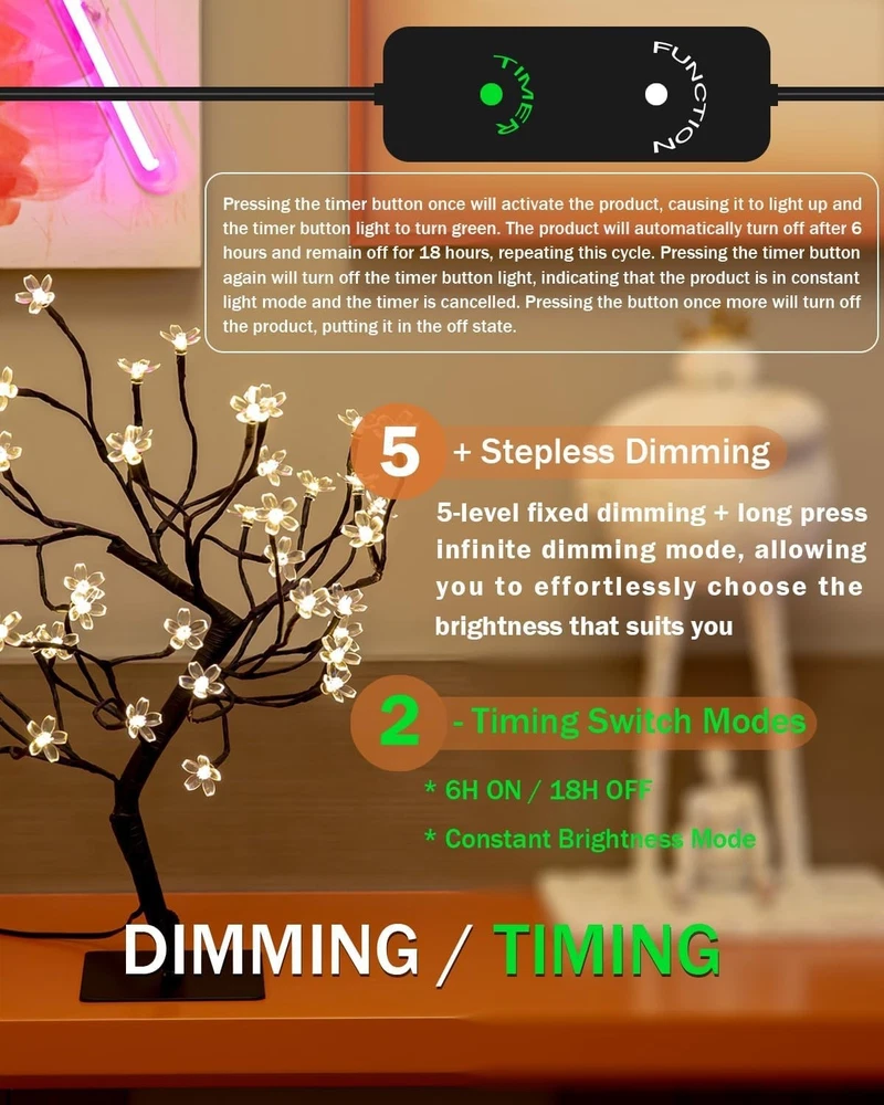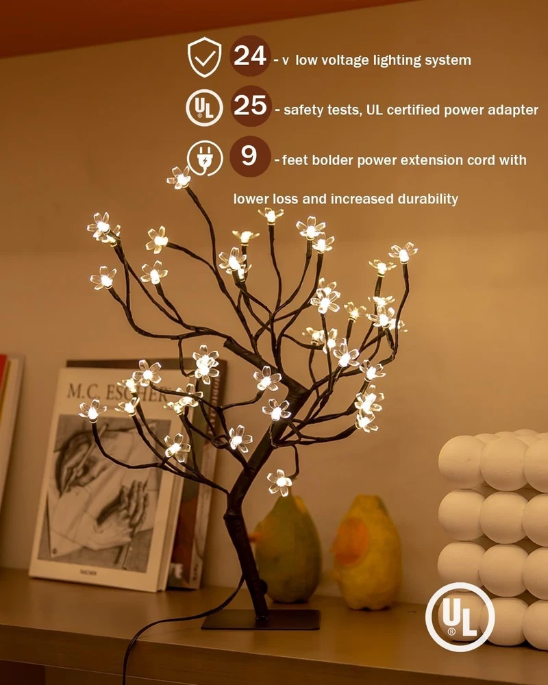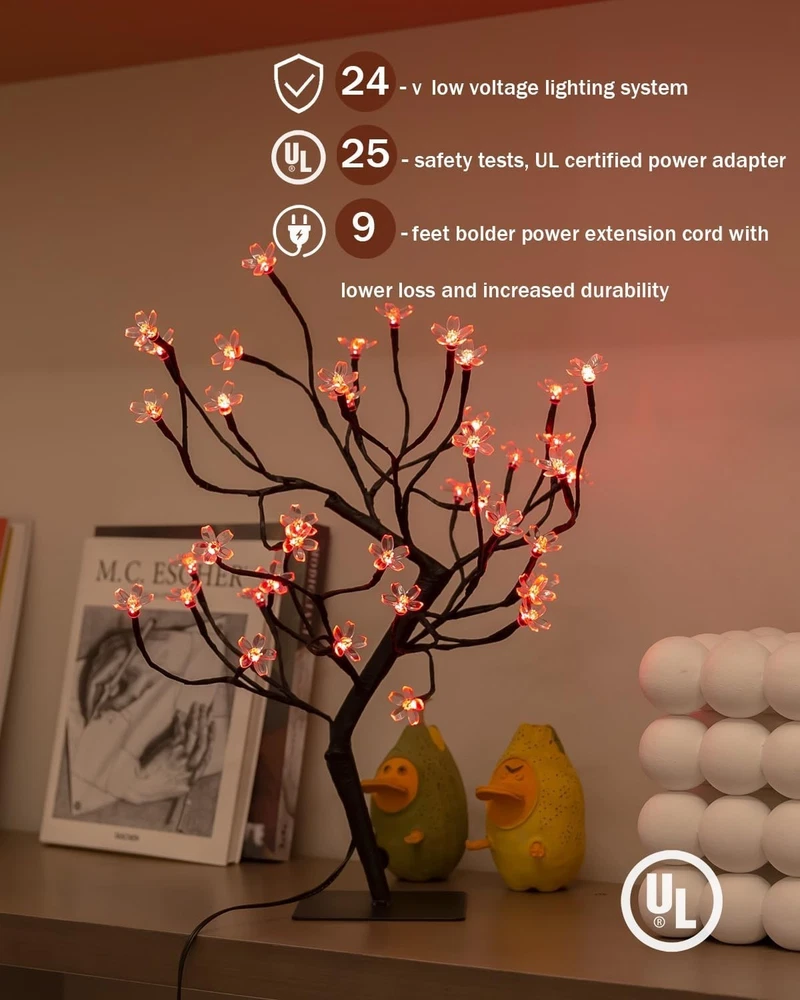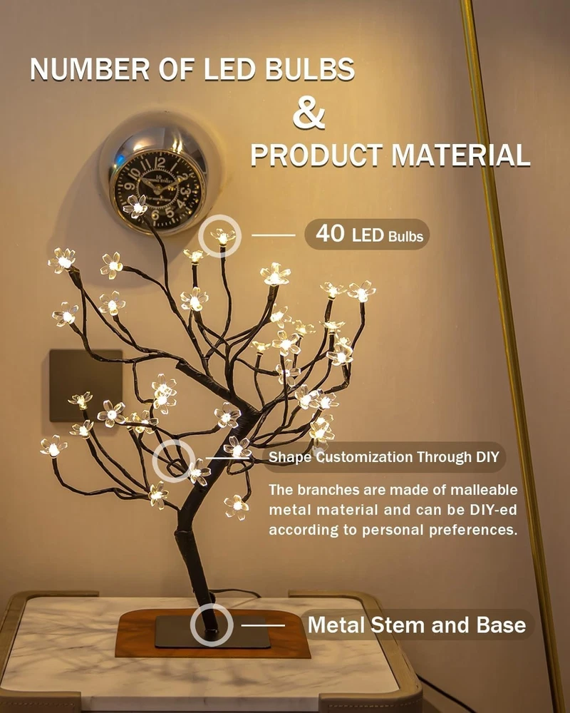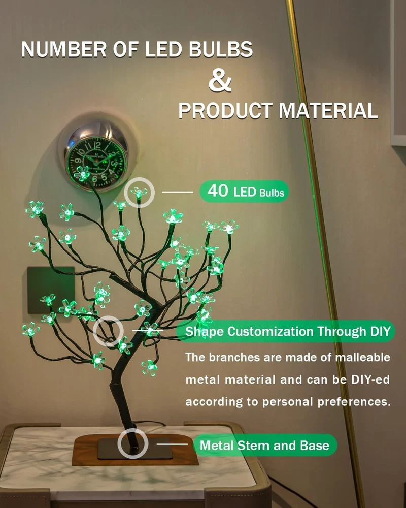 Specification: Overall height 20 inch, 40 LED lights, RGB Lights with remote control; Power adapter is included. REMOTE CONTROL AND TIMER ARE INCLUDED: the powerful remote control not only allows you to select your favorite color from hundreds of color options, but also can adujust the brigtness that you feel confortable. Many lights motions are also available at one click. Lights are changing automatically, and more for you to explore. Thanks to the timer, one can schedule lights on for 4/6/8 hours daily. Applications: Perfect for home, bedroom, living room, balcony, balcony window, office room, children's room, restaurant, porch, pavilion, shelf, for Christmas, New Year, parties, birthday parties, wedding ceremony, dinner party decoration. Bendable branches for DIY: Adjustable branches can be customized for different shapes. You can bend the branches into any shape as you like. Never let anyone or anything to limit your creative, customize your unique tree looking today. Safety: tree light is driven by Worry-free UL listed power source. Electric will not over heat even lit for long use. Long life span up to 25,000 hours.