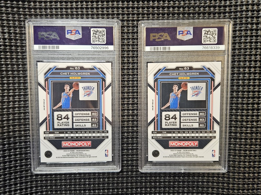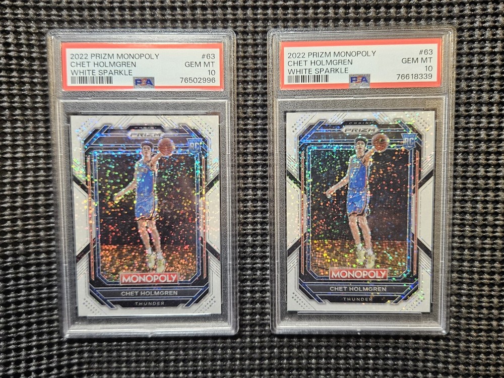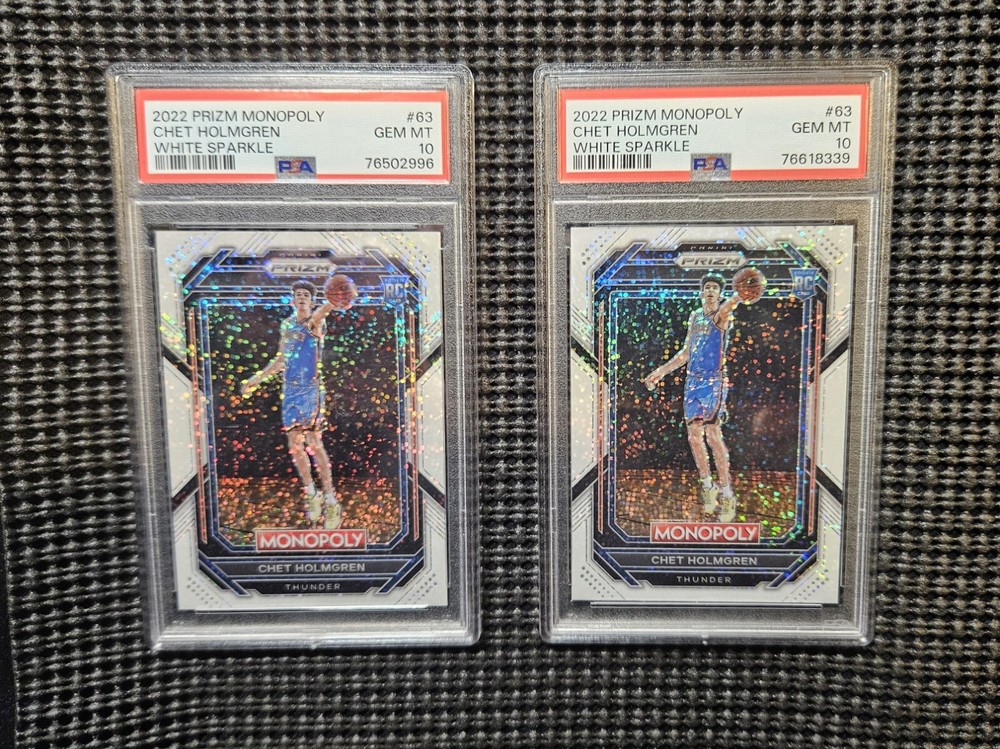 Chet Holmgren RC White Sparkle PSA 10 - Lot x2 - RARE Gem Mint ROOKIE Prizm SPs This listing is for TWO Chet Holmgren 2022-23 Panini Rookie card White Sparkle Gem Mint PSA 10's.