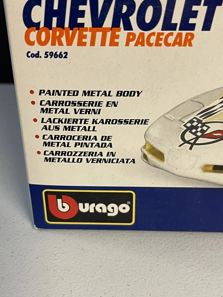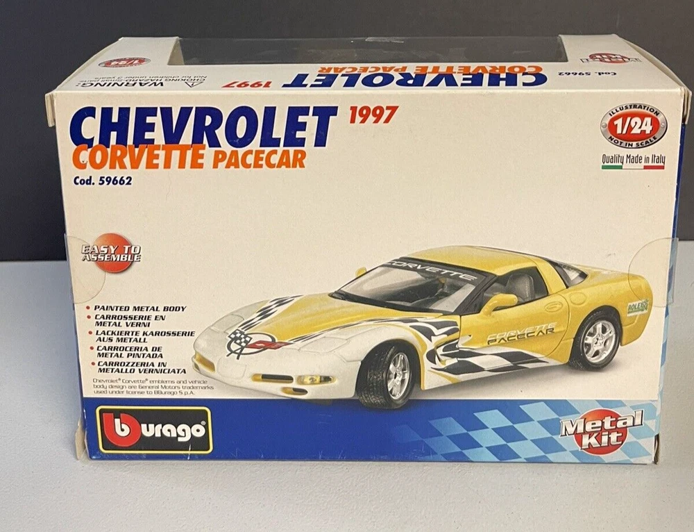 The Chevrolet Corvette Pace Car 1997 Metal Kit by Burago is a vintage unassembled car kit in 1:24 scale. This model kit features a yellow Chevrolet Corvette pace car from 1997, made of metal material. The kit includes all the necessary parts to assemble a detailed replica of the iconic Corvette, weighing 1.4 pounds. With a focus on accuracy and quality, this Burago kit is a perfect collectible for automotive enthusiasts and model builders alike. T hank you for looking. This item is from a smoke free home. Please view all the photos. Check out all my other items.