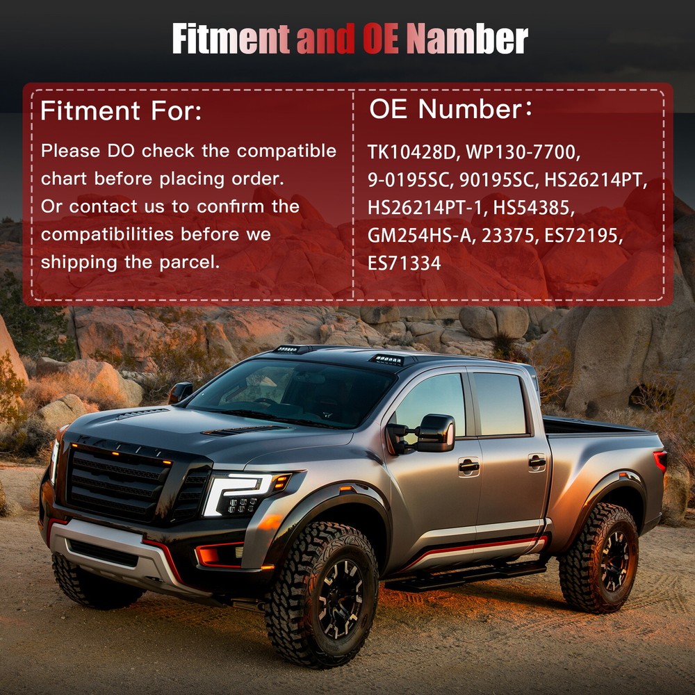 Compatibility should be checked and confirmed before placing order! Steps of confirming the compatibilities: Manage " My Garage ", and chose the right one when placing order; Or chose the " Year / Make / Model / Trim / Engine " of your vehicle on the compatible chart; Or Contact us if you have any question in confirming the compatibility, to make sure you will get the right and compatible item. ### You will get what you see in the picture showed. About US: We are committed to making the best auto-parts products and providing you with better services. So if you have any quesiton or problem, please fell free to contact us about that. Payment: Paypal and other methods which are acceptalbe by eBay. Shipping: All item will be packed with well condition in box or envelope, we make sure the item is in good protection, also please check all the item when you get the package. Product will be shipped within 2 business days after full payment is received and verified. All domestic orders will be shipped via USPS, UPS or FedEx from our US warehouse and usually arrives to your door in about 2-7 business days. Returns & Refund: 30-day free return will be provided. -Please note that the situations below will not be incounted: -Ordered by mistake. -Don't like it. -Duplicated orders. -Damaged product during installation. Contact Us: Any quesiton or problem, do contact us please. We are always online to answer. WARNING: Cancer and Reproductive Harm - www.P65Warnings.ca.gov. End Save for Web Slices