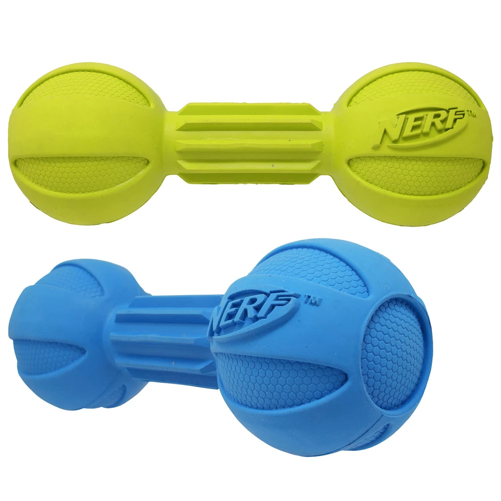 Shaped like a barbell, this design makes it easy for dogs to carry around for playtime and keeps them engaged for hours. As an added bonus, the barbell shape and ridged textures massage gums and help keep teeth clean and tartar-free! Not only is the barbell a fun dog toy, but it's also built to last! Constructed from food-heavy-duty rubber this dog toy is made with your dog's safety in mind. NERF-TOUGH: Nerf-quality materials make our Barbell Chew Toy perfect for fetch and for teaching your dog new tricks HEALTHY TEETH: The unique barbell design and ridged texture makes it easy for your dog to massage gums and help keep teeth clean and tartar-free MADE TO LAST: Lightweight, durable, and weather & water resistant FOR MEDIUM AND LARGE BREEDS: 7.5 inch barbell toy is ideal for medium and large breeds SAFETY FIRST: Designed with you dog's safety in mind, each of our dog toys are tested to ensure endless hours of family fun