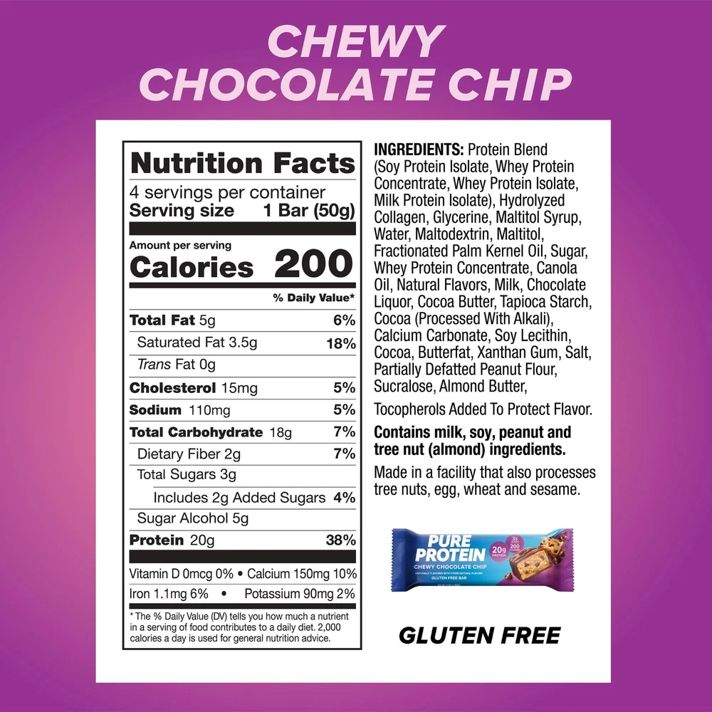 Protein Chewy Chocolate Chip Bars are delicious high protein snacks with high quality protein that support lean muscle and strength. Each protein bar contains 20 grams of protein, 190 calories and 2 grams of sugar to support your busy and active lifestyle. Grab a Protein bar for high quality protein, an essential part of a nutritious, balanced diet. Whether you prefer to enjoy Chewy Chocolate Chip protein bars pre workout, post workout, or on the go, you’ll love the taste of these protein bars. Protein is proud to offer high protein snack bars with low sugar and great taste. For best results, drink 8 ounces of water or other liquid with these gluten free protein bars. New Look! Chewy Chocolate Chip, 20g Protein, 1.76 oz, 4 Ct Each chewy chocolate chip protein bar contains 20 grams of protein, 2 grams of sugar, and 200 calories These 20g protein bars offer delicious chocolate peanut butter flavor in every bar *Protein products contain 5g of sugar or less. Enjoy gluten free protein bars with low sugar * pre workout, post workout, or on the go These low sugar * protein bars provide high quality protein, an essential piece of a nutritious, balanced diet