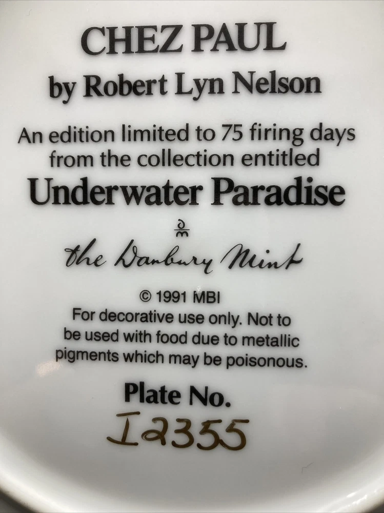 Chez Paul is a limited edition 8 1/8 inch collector plate from the Underwater Paradise Danbury Mint Collection. This plate is in excellent condition. See more limited edition collector plates, stained glass clocks and vases and Precious Moments collectibles at GiftyGold.com.