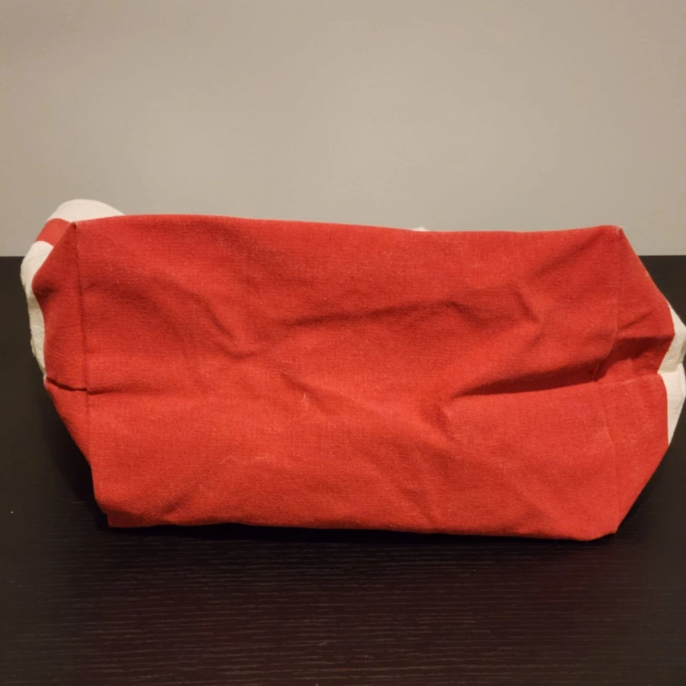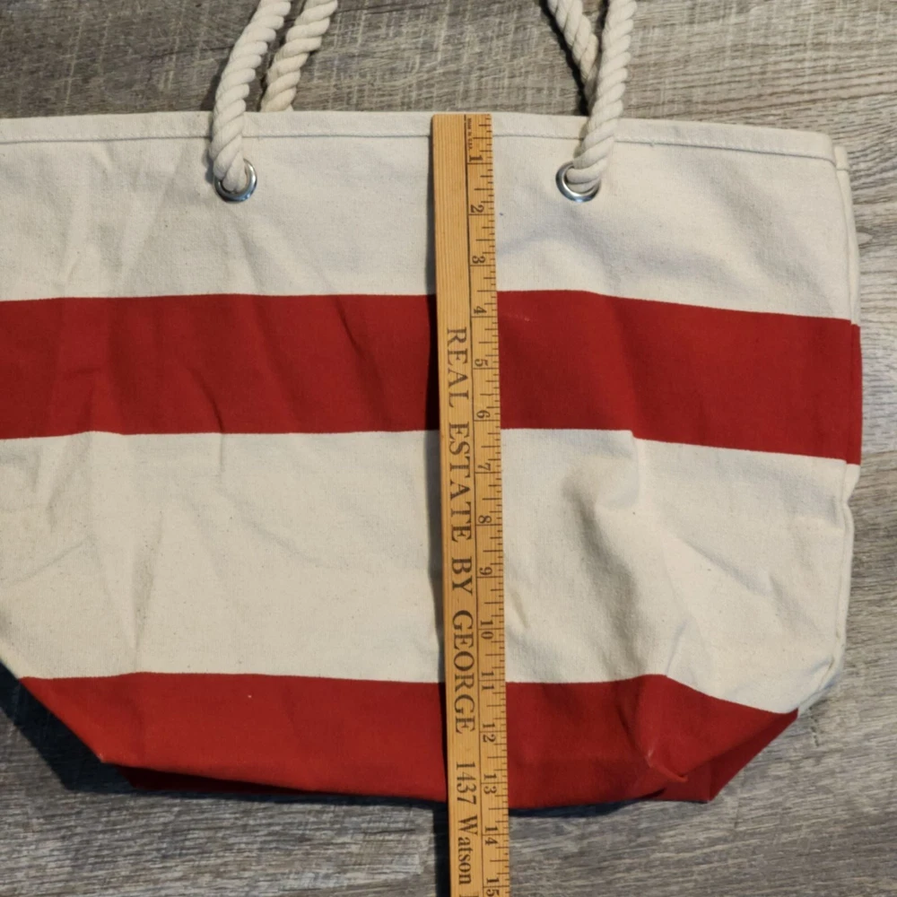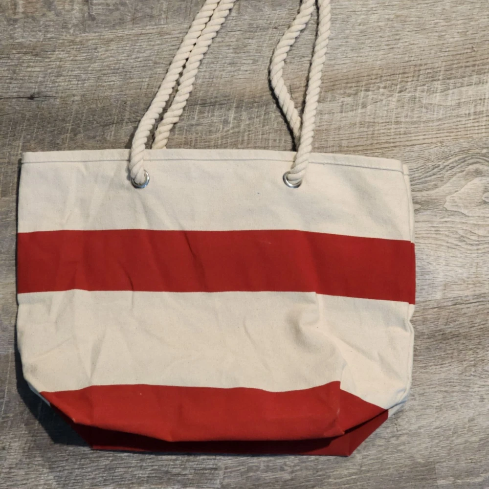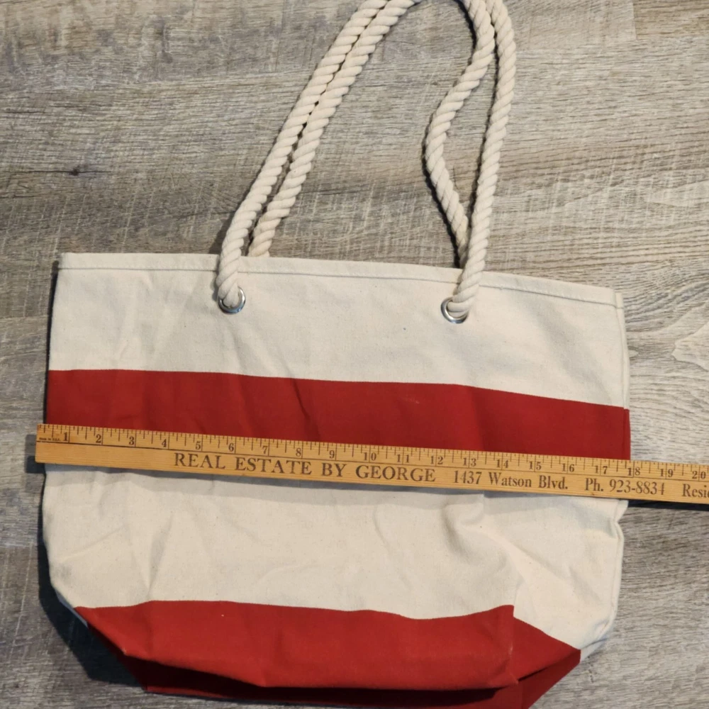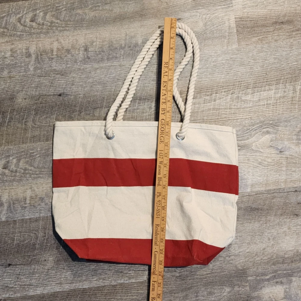 This is a Chic-Fil-A red and cream canvas tote bag with rope handles. This bag is sturdy and strong. The measurements are in the photos. There are some minor signs of use, but no rips, tears, or staining that I found. The Chic-Fil-A logo is on the front with "Seas the Day" as part of the logo. I believe the tote was originally red and cream, but the red has faded some and now looks more like burnt orange. The canvas bag is in excellent condition though. Features: • Beach Tote • Striped • Made in Pakistan • Machine Washable Condition: Pre-Owned Good Excellent Condition SKU: 23-380/6
