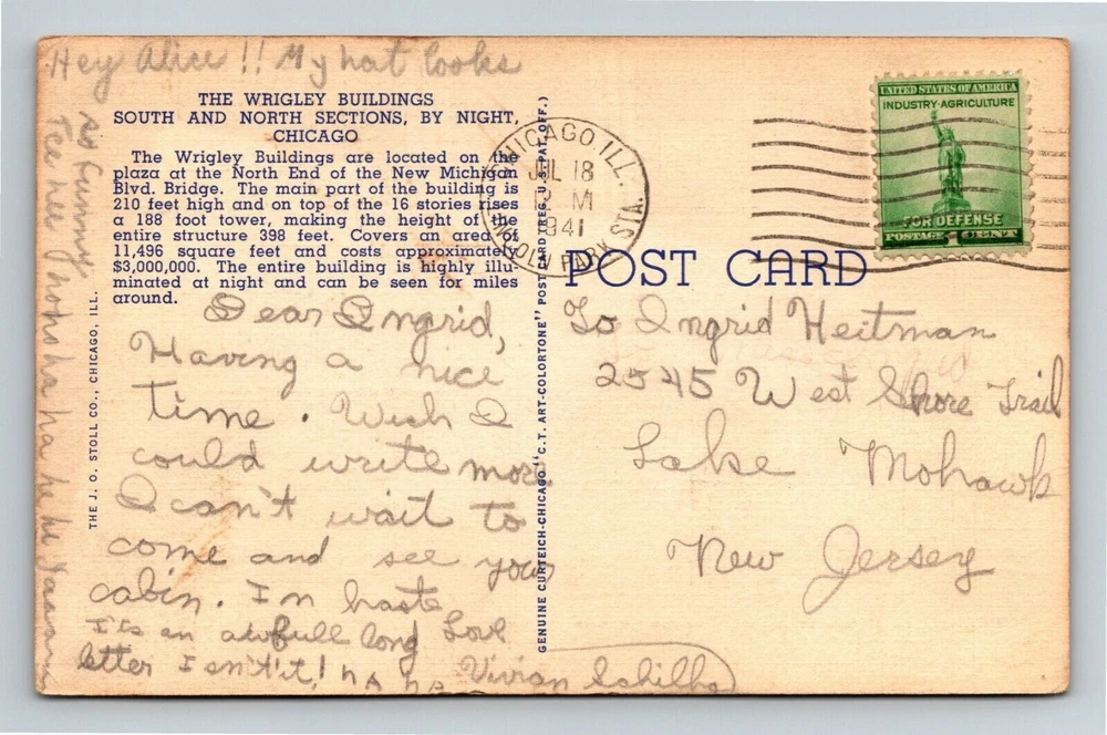 Chicago, 1924 Wrigley Building By Moonlight, River VintageIllinois 1941 Postcard