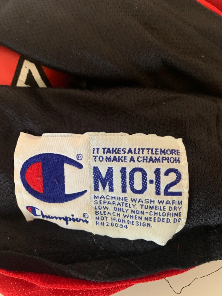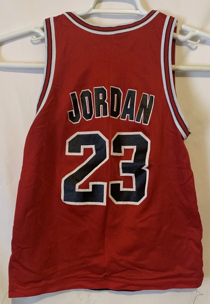 The product is a red Chicago Bulls #23 Michael Jordan Champion jersey in size M. It features a pit to pit measurement of 16". The jersey represents the National Basketball Association (NBA) and is an official fan apparel item. This Jordan brand jersey is designed in honor of the legendary basketball player Michael Jordan and is manufactured in Jordan. It is a must-have for any fan of the Chicago Bulls or basketball enthusiast looking to showcase their support for the team and player.