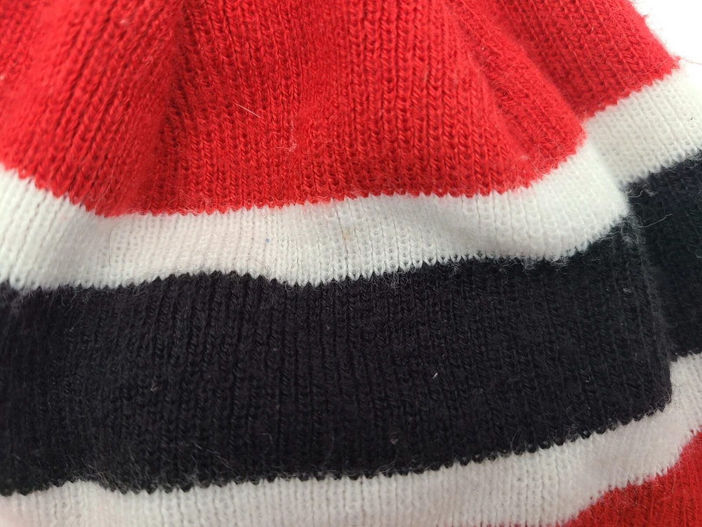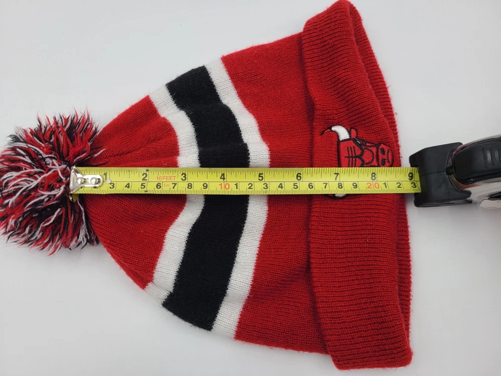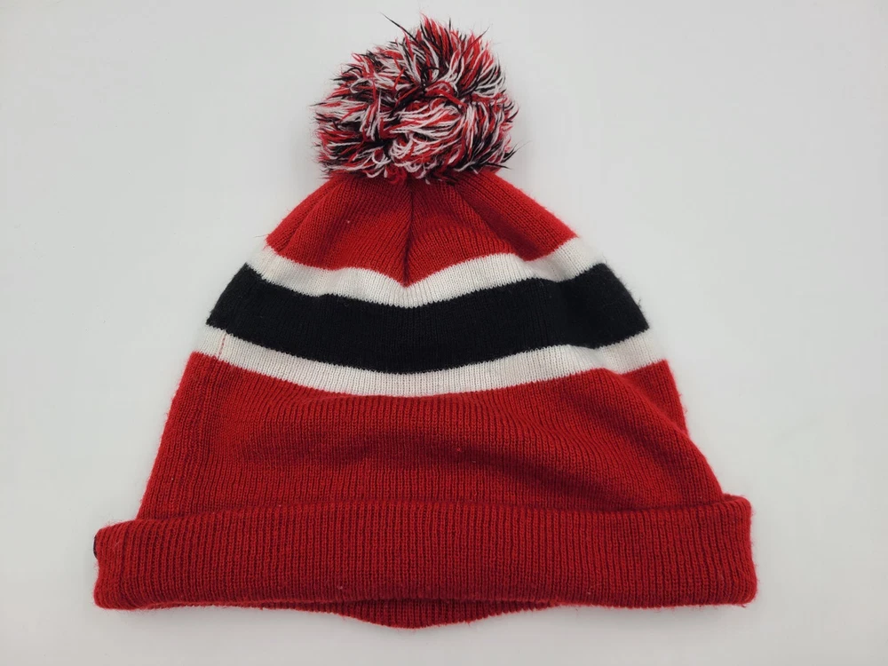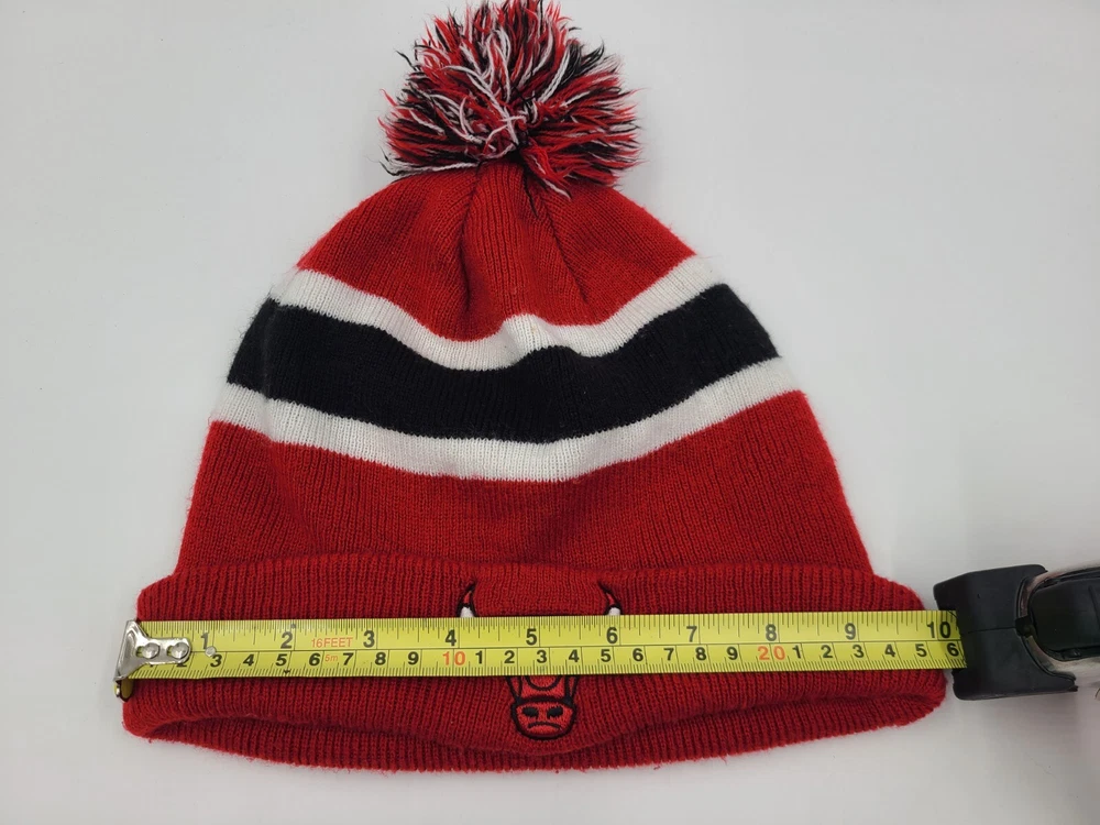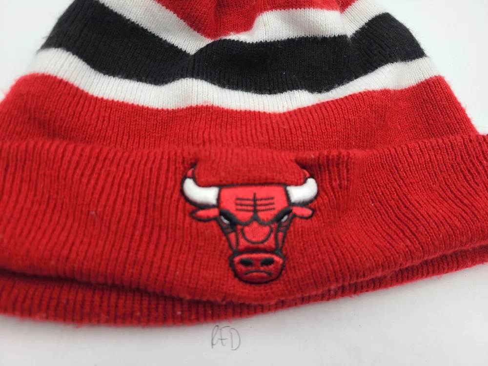 Has some wear on the front as seen in photos. Chicago Bulls Beanie Pom Winter Knit Cuffed Hat Stocking Cap NBA Red Black White. EACH ADDITIONAL HAT PURCHASED IS ONLY $1 ADDED SHIPPING!