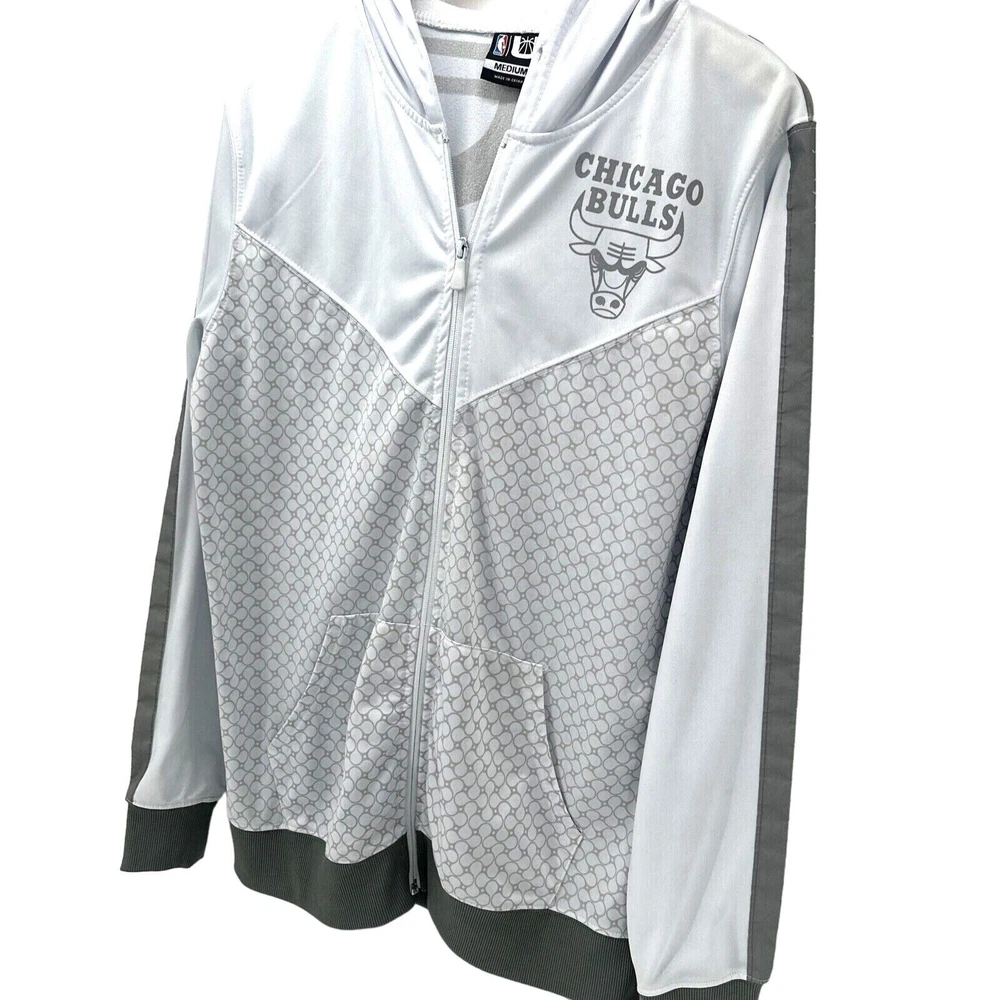 NBA Chicago Bulls Men's Hoodie Jacket Size Medium White Gray/Silver Full Zip Long Sleeve NO DRAWSTRING Very good condition, there is wear along the crease of the arm band, see all pictures for views. * Pit to pit: 21" * Shoulder to hem: 29" Ships out same day or next open postal day. Thank you for your purchase, we appreciate you!