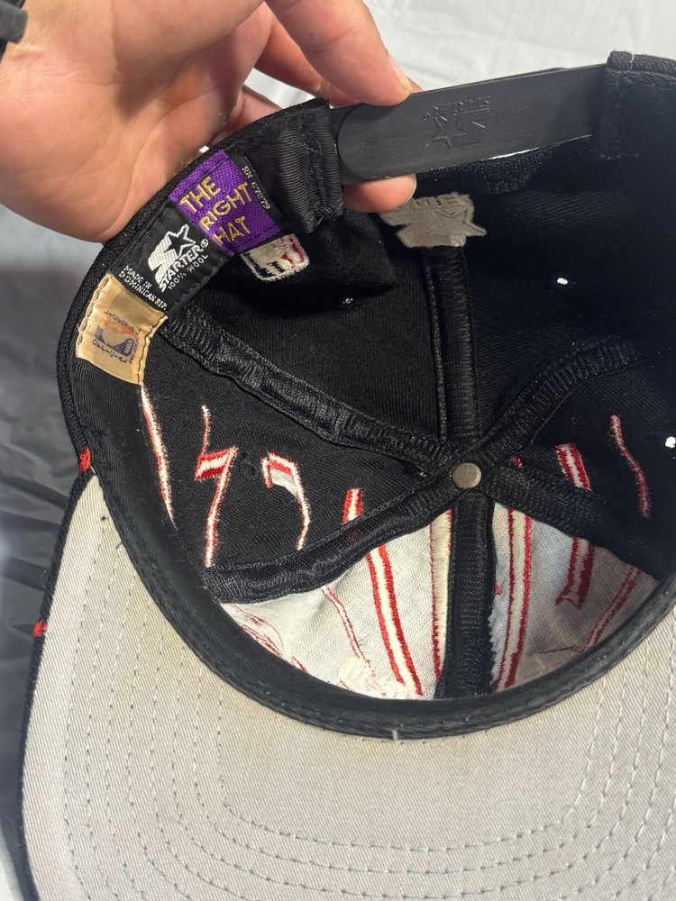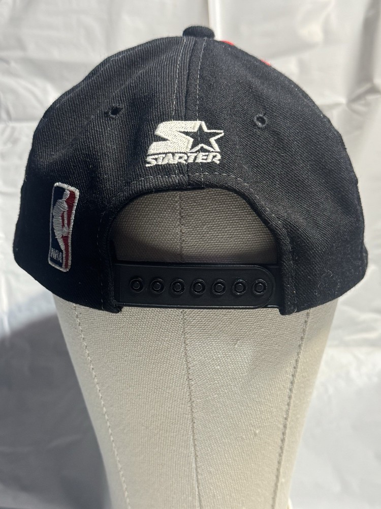 The Chicago Bulls NBA Collision Starter Snapback Hat is a vintage piece featuring the iconic Jordan Shockwave design from the 90s. This unisex adult hat in black showcases the classic Starter branding and represents the legendary Michael Jordan and the Chicago Bulls team in the National Basketball Association (NBA). Perfect for any basketball fan looking to represent their favorite team with a unique and nostalgic accessory.