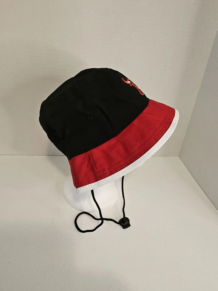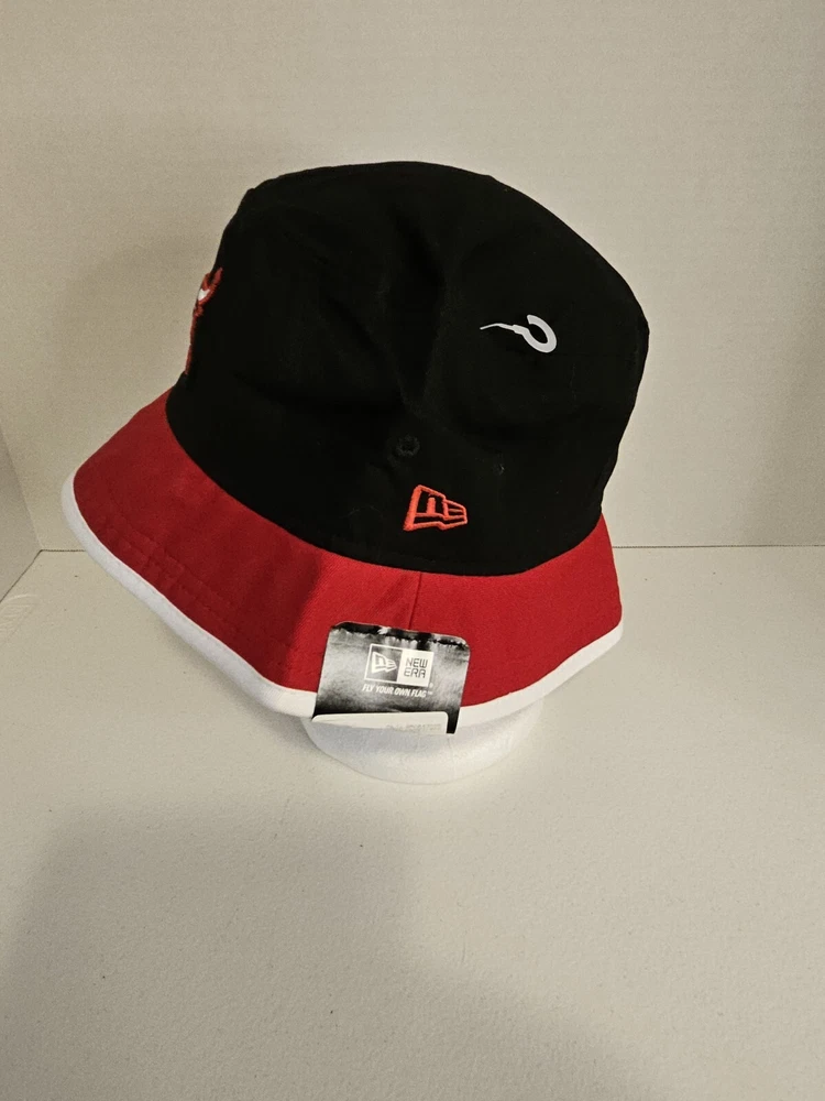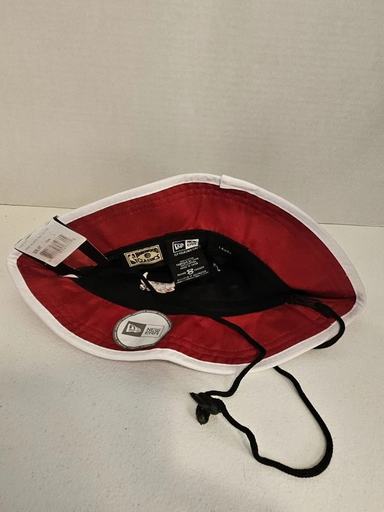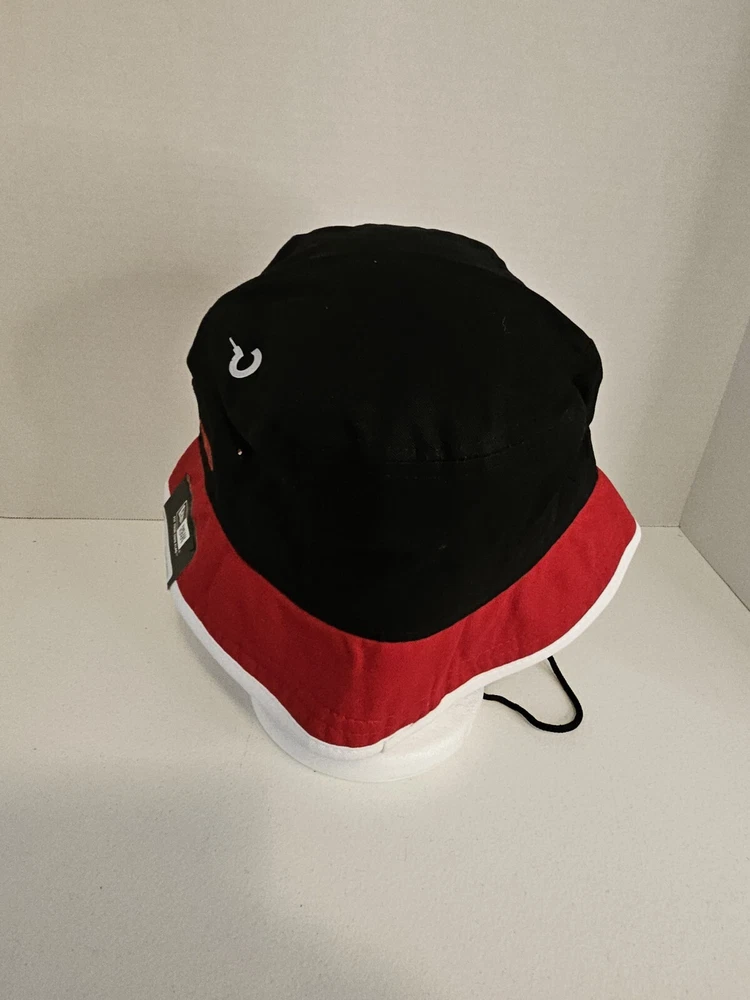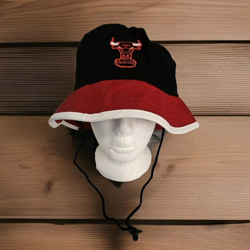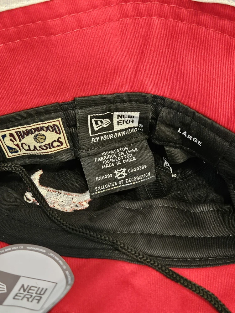 Stay cool and stylish with this Chicago Bulls New Era Bucket Fishing Hat Cap. The hat features a solid pattern in red, black, and white, with a strap for added comfort. Perfect for any occasion, whether you're traveling, hitting the basketball game, or just want to add some sports flair to your casual or business attire. This hardwood classics NBA bucket hat is designed for men in size large and is part of the streetwear and sports themes. The hat is made by New Era and is perfect for basketball game fans. With its vintage look and feel, this hat is sure to make a statement. Get your hands on this stylish bucket hat today!