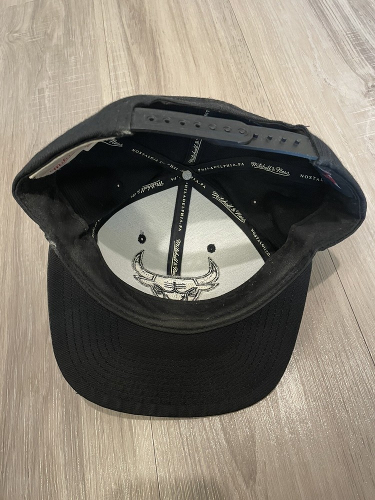 The product is a black Chicago Bulls hat with a snap back closure, featuring the Bulls logo. It is a one-size-fits-all cap made by Mitchell & Ness, an officially licensed brand of the National Basketball Association (NBA). This basketball accessory is designed for men and is ideal for fans of the Chicago Bulls team, perfect for wearing during regular season games to show support for Michael Jordan's former team. The hat is made in Bangladesh and is a stylish way for fans to showcase their team pride.