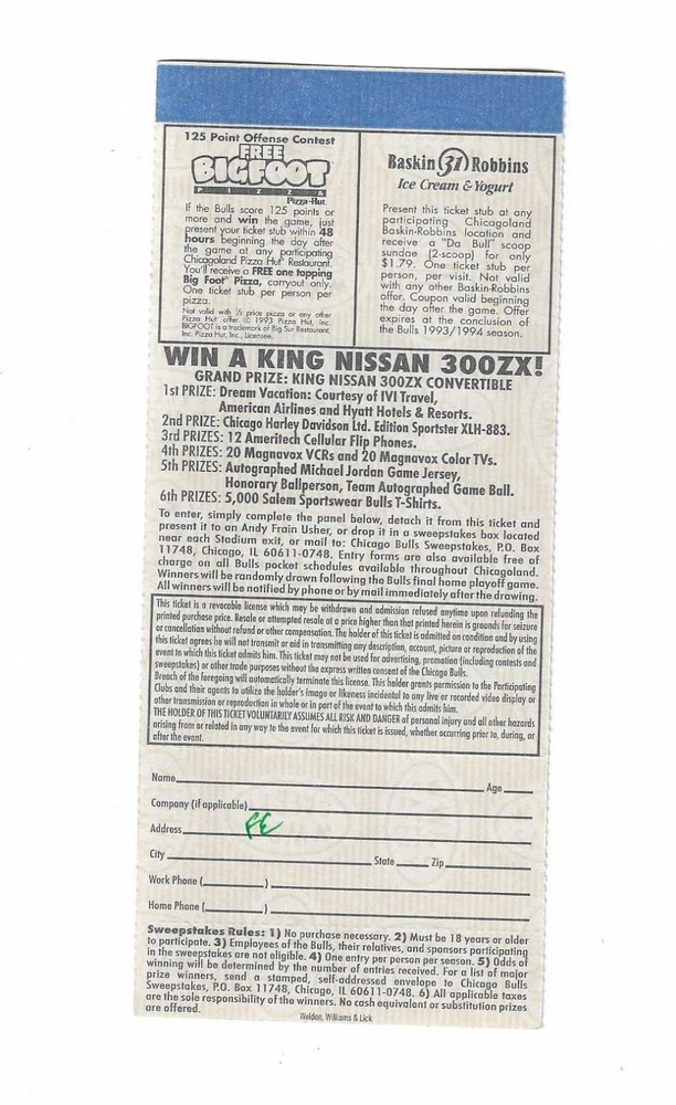 Chicago Bulls vs Los Angeles Clippers Unused Basketball Ticket from 12/7/1993