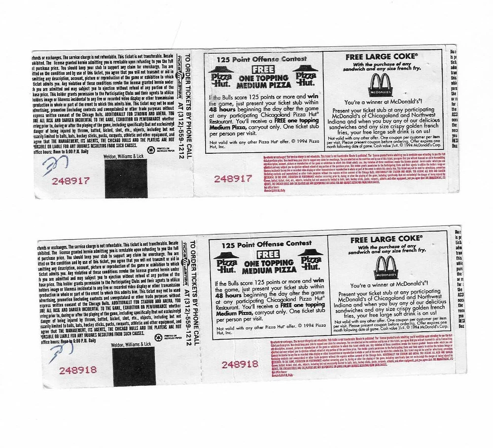 Chicago Bulls vs Utah Jazz unused Basketball Tickets From December 17, 1994 Here are 2 unused Chicago Bulls vs Utah Jazz Basketball Tickets from December 17, 1994. The game took place at The United Center in Chicago, Illinois. The tickets are in fair condition and would make an excellent addition to your collection. Payment Payment is due within 24 hours of sale. Shipping Your item will be shipped within 24 hours of receipt of payment via US Mail.