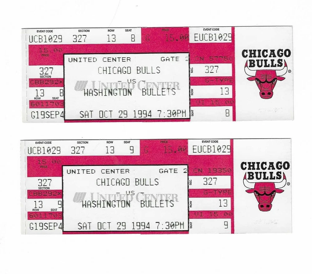Chicago Bulls vs Washington Bullets Unused Basketball Tickets From October 29, 1994 Here are 2 unused Chicago Bulls vs Washington Bullets Basketball Tickets from October 29, 1994. The game took place at The United Center in Chicago, Illinois. The tickets are in good condition and would make an excellent addition to your collection. Payment Payment is due within 24 hours of sale. Shipping Your item will be shipped within 24 hours of receipt of payment via US Mail.