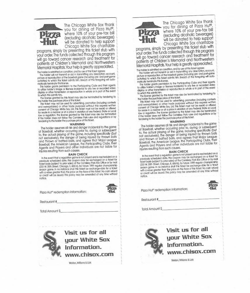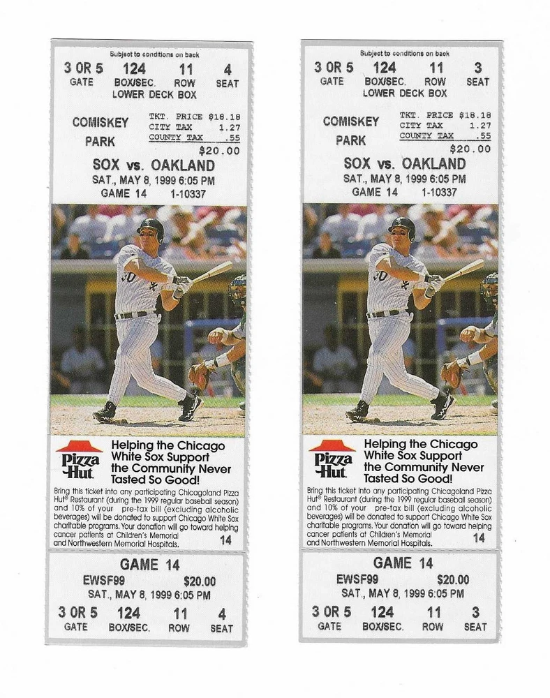 Chicago White Sox vs Oakland A's Unused Baseball Tickets From May 8, 1999 Here are 2 unused Chicago White Sox vs Oakland A's Baseball Tickets from May 8, 1999. The game took place at Comiskey Park in Chicago, Illinois. The tickets are in good condition and would make an excellent addition to your collection. Payment Payment is due within 24 hours of sale. Shipping Your item will be shipped within 24 hours of receipt of payment via US Mail. Terms and Conditions All Sales are final. No Refunds
