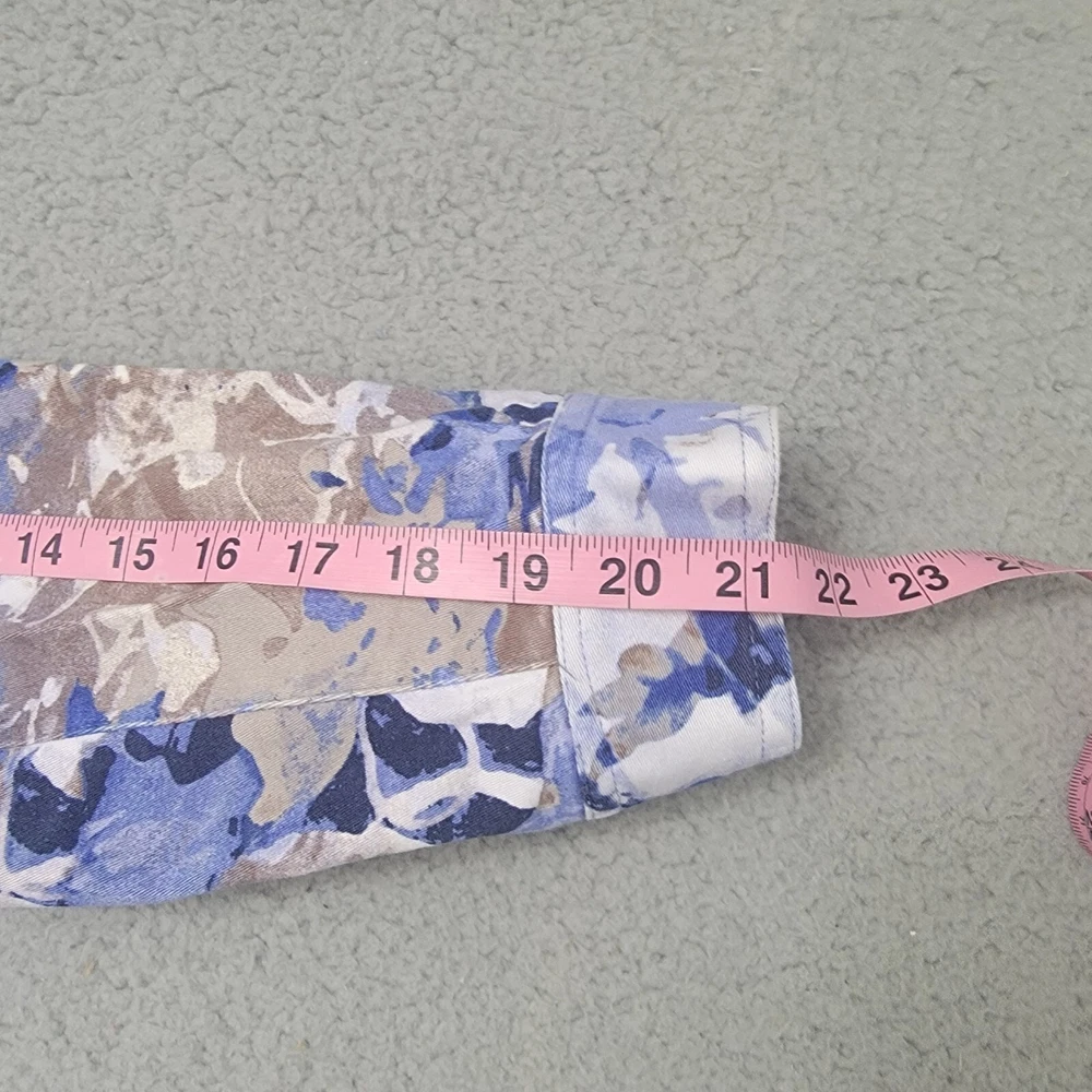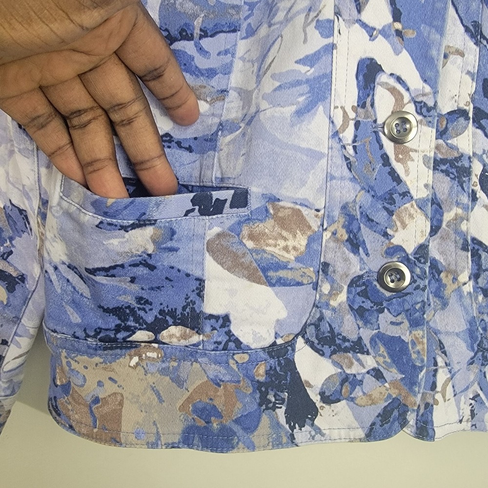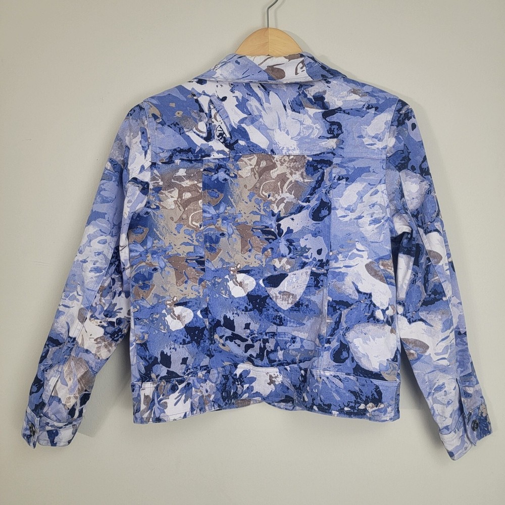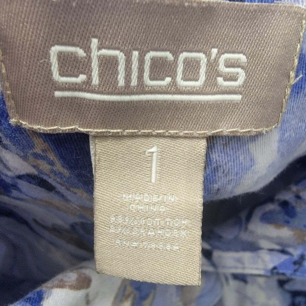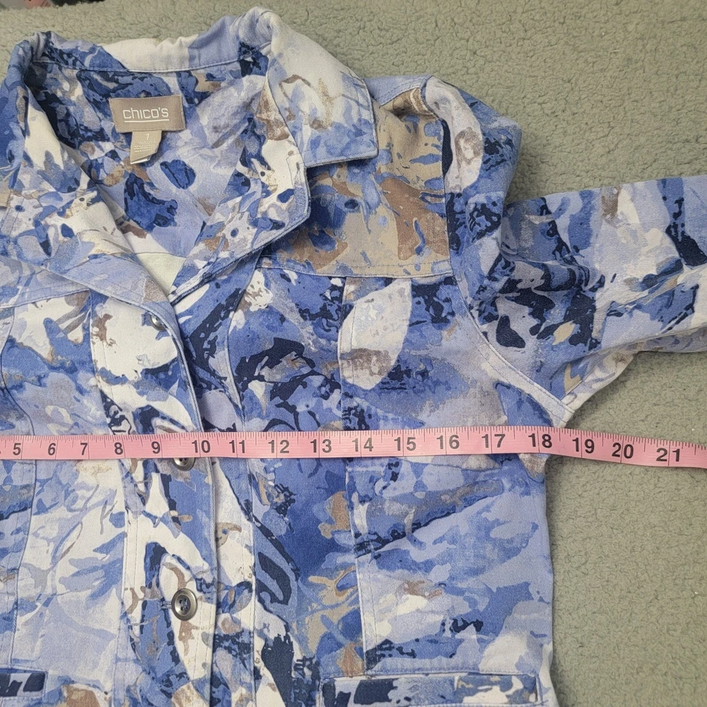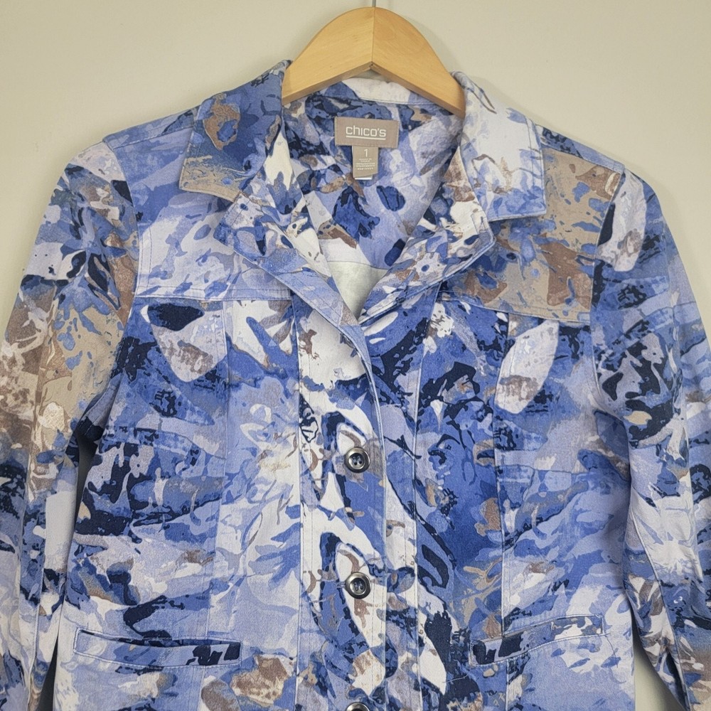 Chico's Abstract Floral Denim Trucker Jacket Button Front Pockets Collared Sz 1 . Pre-owned in good condition. Please review photos for details and let me know if you have any questions
