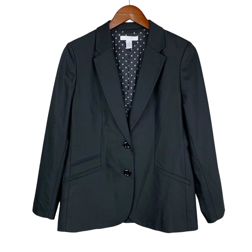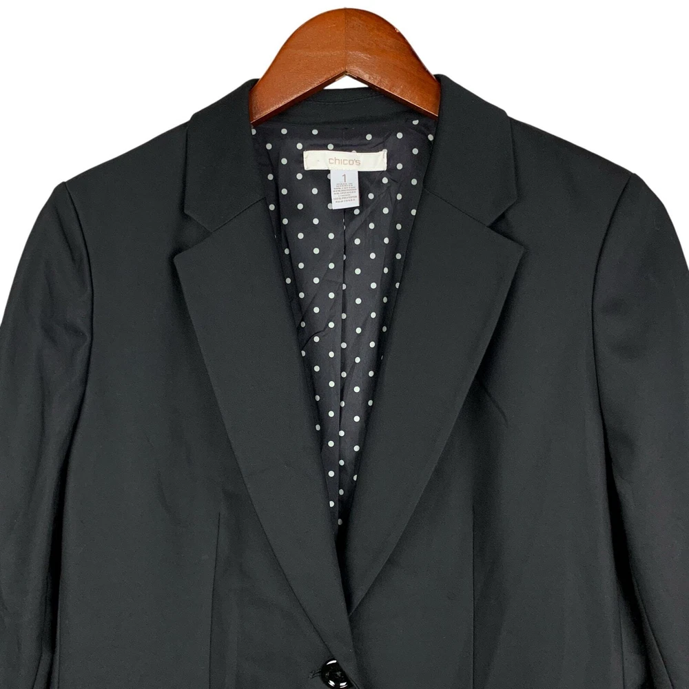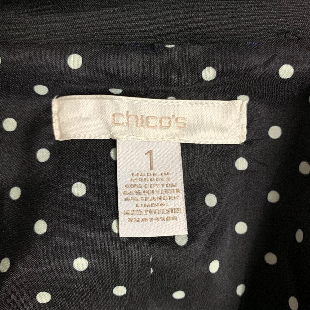 Chico’s blazer jacket in women’s brand size 1 or medium 8. Long sleeves with buttons. Two buttons on the front. Lined. 50% cotton 46% polyester 4% spandex. Polyester lining. Dry clean. Excellent condition! Chest: 19.5” across Waist: 18.5” across Sleeve: 16.5” along underside Shoulder to hem: 26.5”