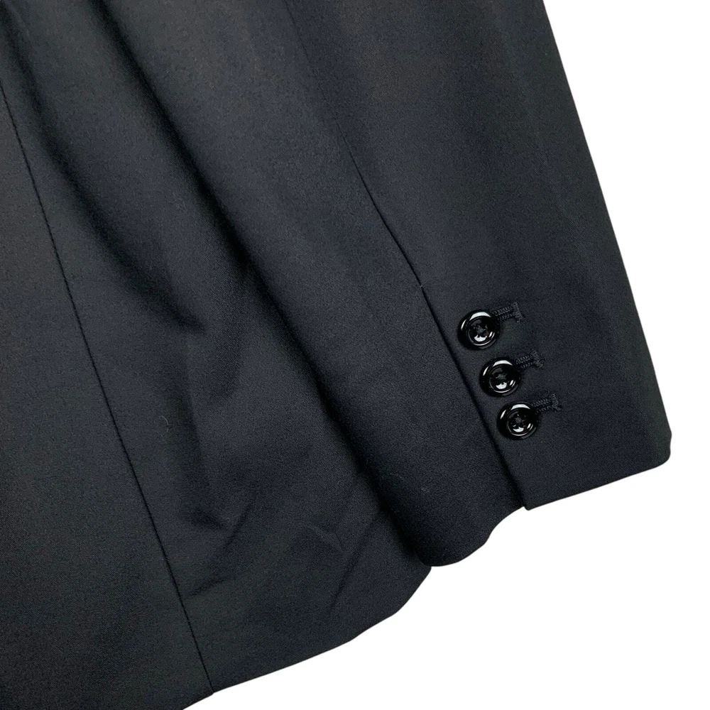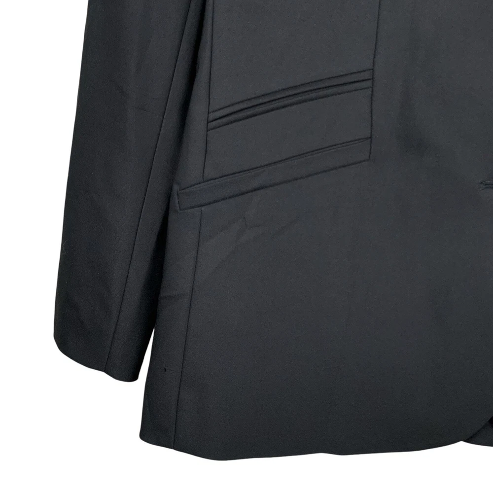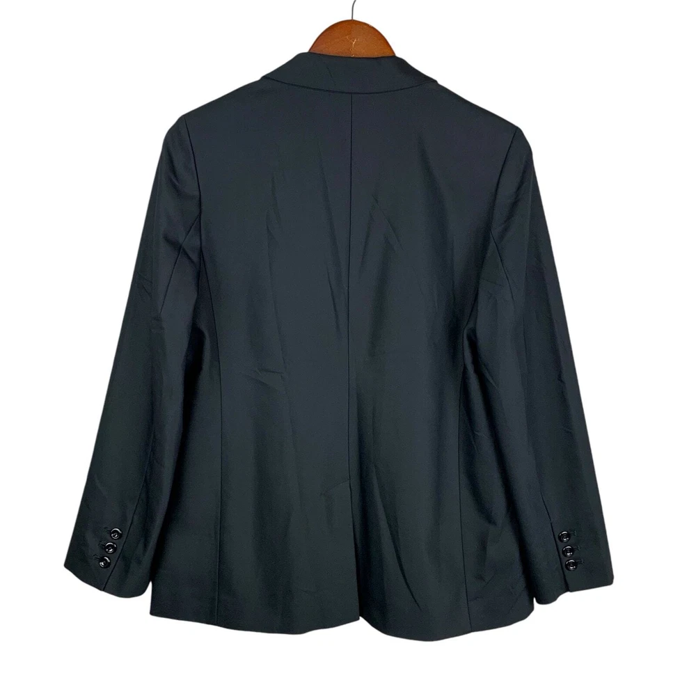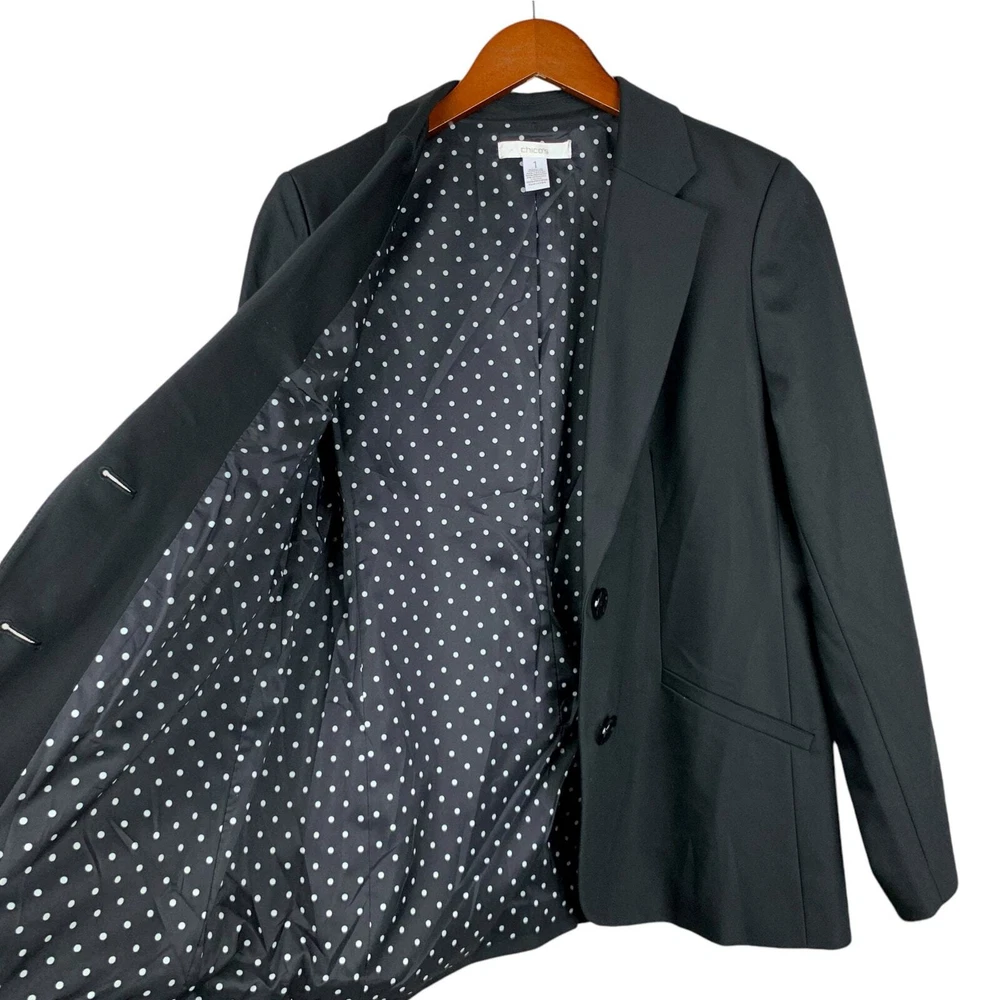 Chico’s blazer jacket in women’s brand size 1 or medium 8. Long sleeves with buttons. Two buttons on the front. Lined. 50% cotton 46% polyester 4% spandex. Polyester lining. Dry clean. Excellent condition! Chest: 19.5” across Waist: 18.5” across Sleeve: 16.5” along underside Shoulder to hem: 26.5”