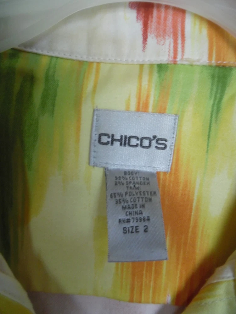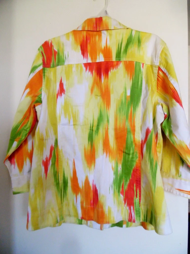 Chicos Cotton Button Front Jacket Sz 2 Multi Color Armpit-armpit: 22" Sleeve Length 20" Length: 27" AT Combined Shipment: USA : Highest item shipping cost + $3.00. for each subsequent item.Or, you can purchase as many items as you choose and pay the flat rate of $18.75 for your Priority Mail Large Flat Rate Box which covers your entire order. Please read the disclaimer below. INTERNATIONAL SHIPMENTS: Highest item shipping cost + $5. for each subsequent item. Please read the disclaimer below. DISCLAIMER on Shipping Costs: Our intention is to keep our shipping costs as low as possible. However, depending on the item purchased (weight) and the destination, shipping rates can vary; especially 30 Day?s No Questions Asked Returns Policy: Your satisfaction is very important to us. We have a 30 days NO QUESTIONS ASKED returns policy. The item must be returned in the condition in which it was purchased. If there are labels/tags they should not be removed. If they are, the item will be sent back to you. ANY SHIPPING COSTS WILL NOT BE REFUNDED. BOTH WAYS, receiving and any returns. Please contact us for the return shipping address and authorization. ALL COMMUNICATIONS MUST BE IN WRITING & TAKE PLACE THROUGH THE EBAY SITE ONLY. No private direct email correspondence. A customer care rep. will respond to you within 24 hrs (Mon-Fri). Once we have received the merchandise and inspected it, please allow 72 hours for a refund to be issued. NO See my other listings for more great items! We accept PAYPAL. Also we have a virtual terminal with PayPal through which we can accept Visa, MasterCard, Amex, and Discover. If you do not have a PayPal account, it takes virtually minutes to open International shipments: PLEASE DO NOT PAY until we determine your shipping costs. Most of our items also have an International Flat-Rate. Although, if due to the destination or the weight we are unable to honor the rate mentioned in the item?s listing, we will cancel your order and leave you positive feedback. Usually we use the US Postal Service. The best international rate for an international shipment is First Class (up to 4 lbs.)If your items exceed 4 lbs. we may pack them into two separate packages (and notify you of this).You still are eligible to take advantage of the combined shipping rates, even if we have packed them into two separate packages. The fees for packaging, shipping, insurance, Customs Duty Charges on international shipments are all the responsibility of the Buyer and are not included in the purchase price. If the item(s) are gifts, we could indicate ?GIFT? on the customs form so you would avoid paying more on duty. Add a map to your own listings. FREE Trial!