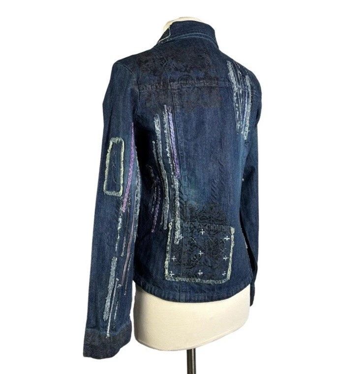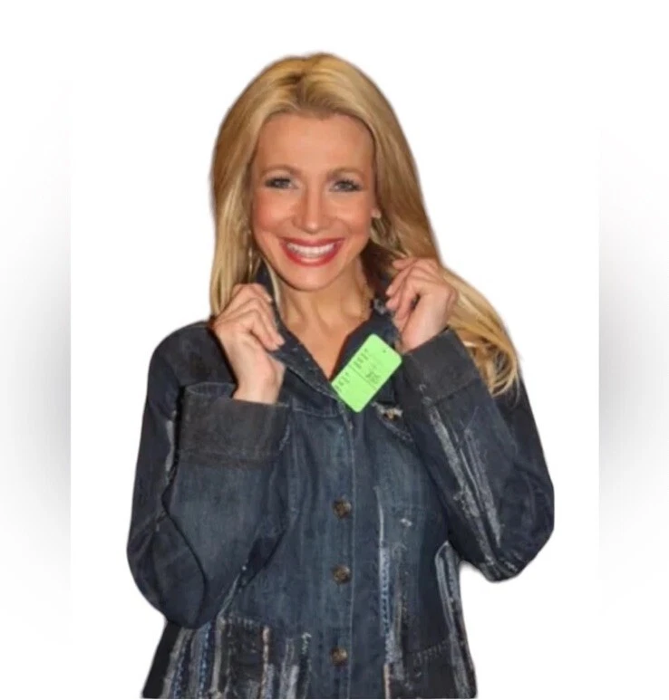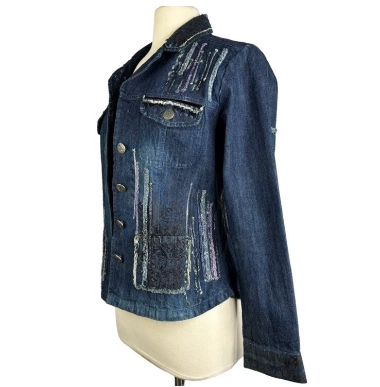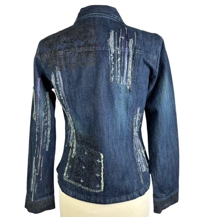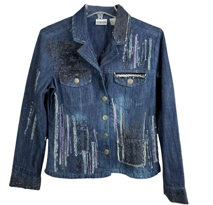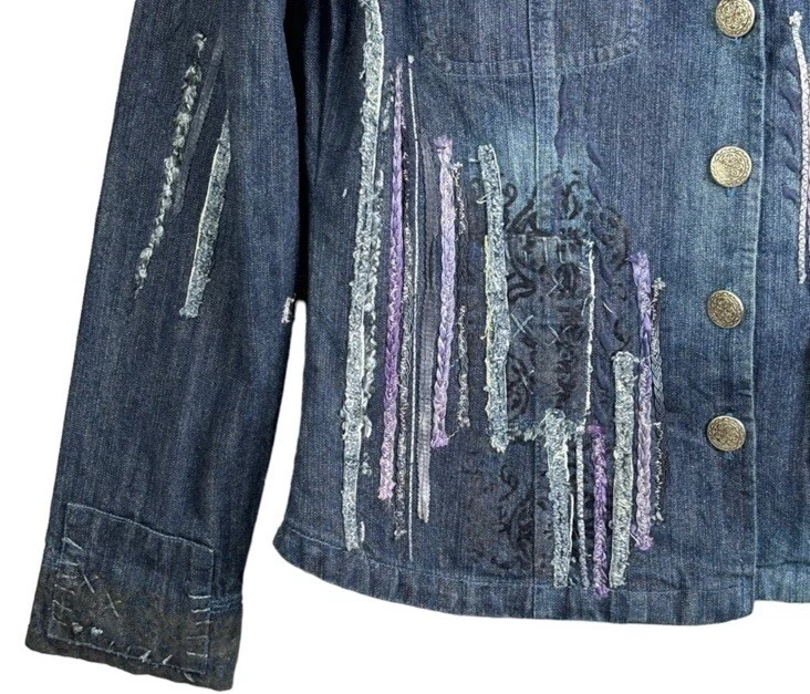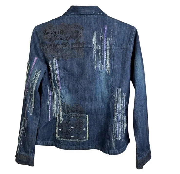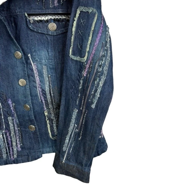 FOX 8 News Anchor Stefani Schaefer is modeling the jacket in the cover shot & gives us a sneak peek of this year’s Designer Dress Days READ Pre Owned Gently Worn ONLY ONCE Excellent Condition Gorgeous Appliqués Patches with Different Shades of Denim Fringed, Frayed, & Purple Accents Measurements Are Approximate to 1/2” Chest 33.5”-34.5” Waist 28”-29” Length 24” Sleeve Length 24” Fabric Content Cotton 100% Note: the top button is missing I didn’t notice when I purchased the piece at Chico’s and it was Clearance & couldn’t be returned. It’s unnoticeable Price reduction by 25% for the minor flaw Clean Home Non Smoking No Indoor Pets Loft240124